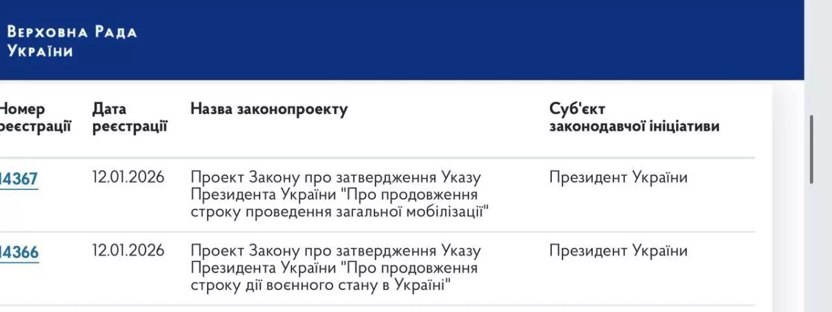 Президент Украины Владимир Зеленский внес в Верховную раду законопроекты о продлении действия военного положения и всеобщей мобилизации на 90 дней с 3 февраля 2026 года.