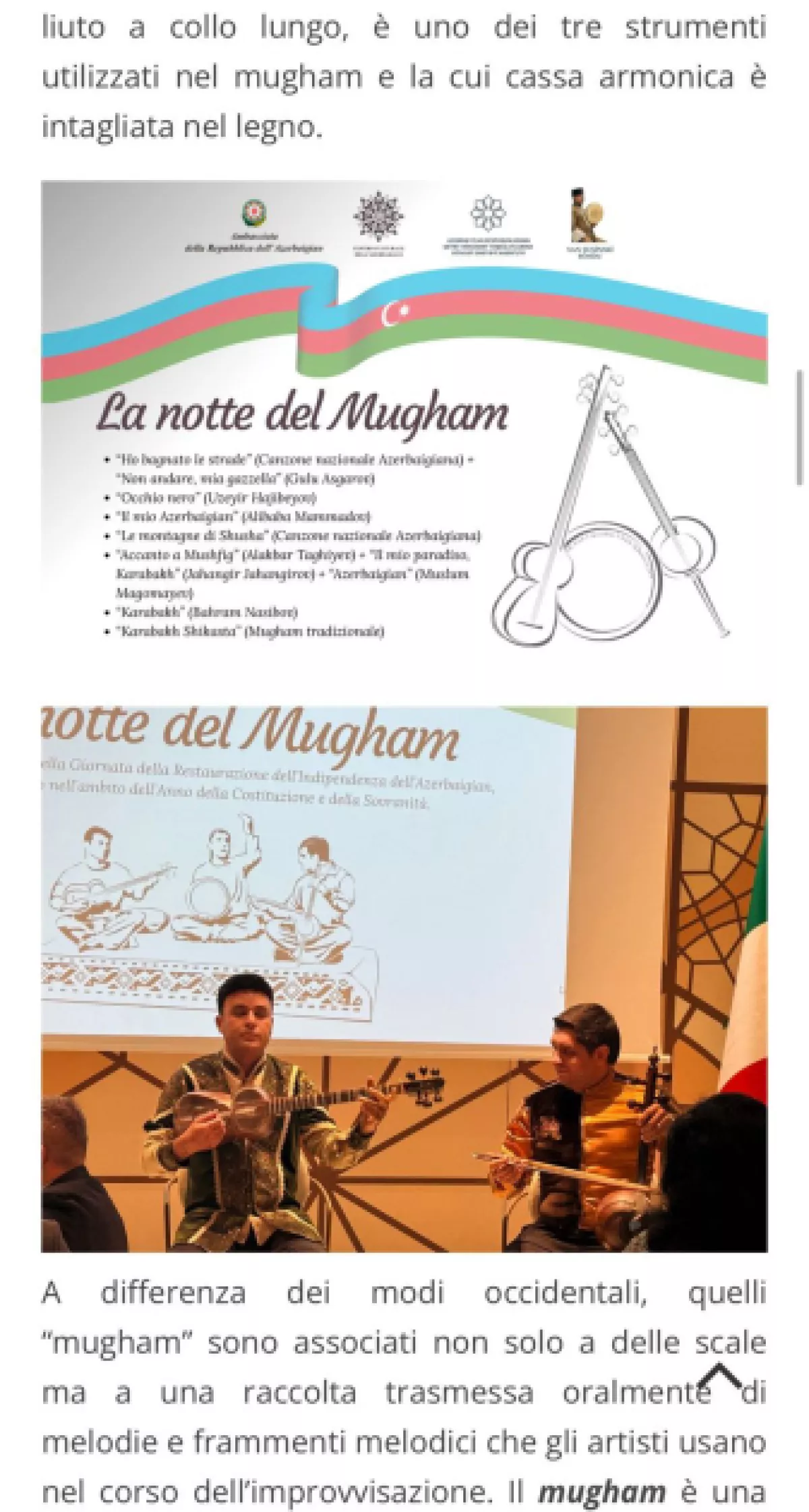 Итальянский портал Eurasiaticanews опубликовал статью «La musica Mugham patrimonio UNESCO a Roma» («Объект Всемирного наследия ЮНЕСКО - мугам в Риме»).