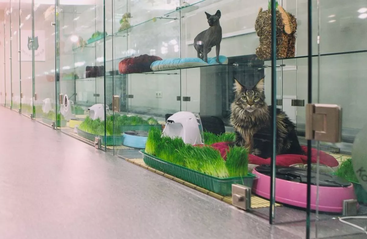 Для кошек предусмотрены регулярное питание, прогулки на свежем воздухе, медицинский уход и даже спа-процедуры. Номера различаются по категориям — от индивидуальных домиков до просторных дуплексов.