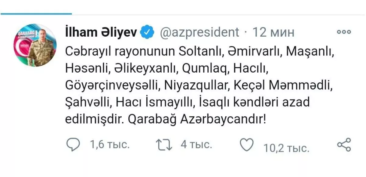 - Доблестная Азербайджанская армия освободила от оккупации села Арыш Физулинского района, Дошулу Джебраильского района, Эдиша, Дюдюкчу, Эдилли, Чирагуз Ходжавендского района. Об этом в своем официальном аккаунте в Twitter написал Президент Ильхам Алиев.