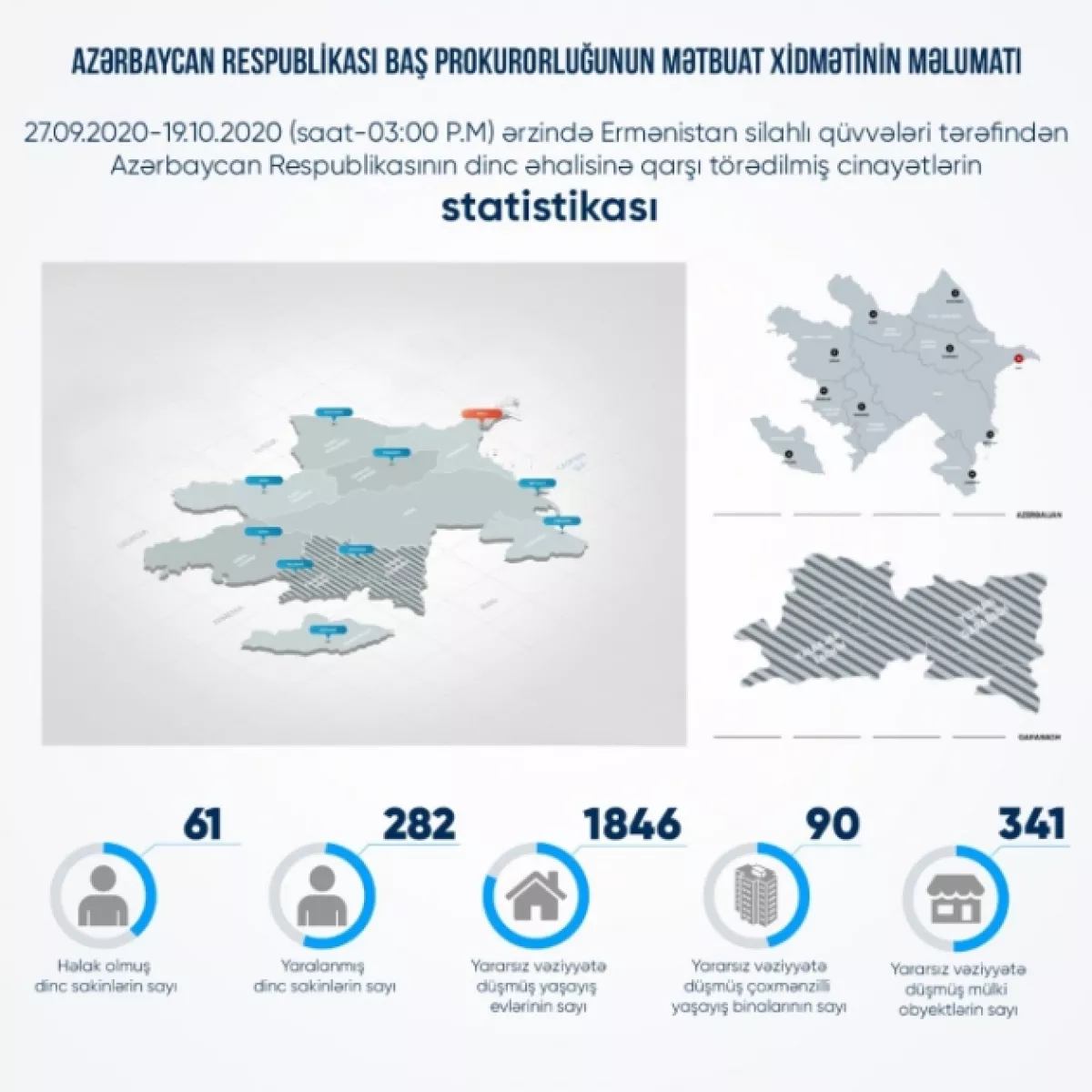 - Вооруженные силы Армении умышленно подвергли интенсивному обстрелу из тяжелой артиллерии кладбище в городе Тертер во время похоронной церемонии. В результате вероломной атаки погибли 3 человека, 5 – получили ранения. Таким образом, число погибших среди гражданского населения достигло 46, а пострадавших – 223 человек. Об этом сообщила Генеральная прокуратура.