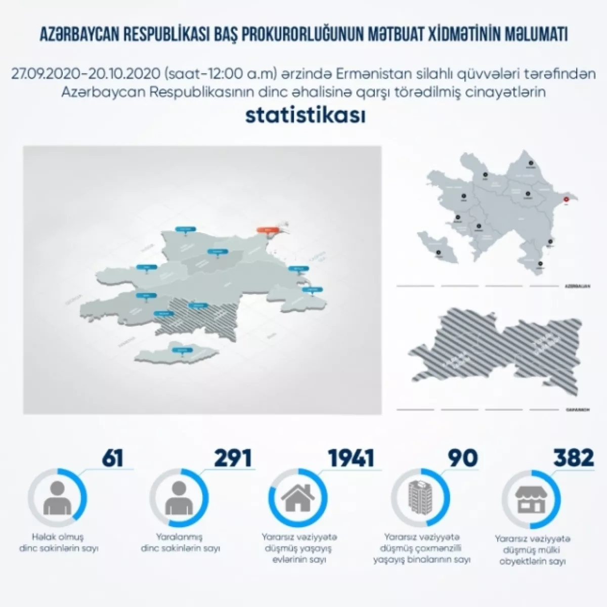 - Число погибших среди гражданского населения в результате обстрела вооруженными силами Армении населенных пунктов Азербайджана из тяжелых артиллерийских установок и ракетных систем с 27 сентября до 12:00 часов 20 октября достигло 61, а пострадавших – 291. Нанесен ущерб 1941 дому, 90 многоквартирным зданиям и 382 гражданским объектам. Информацию об этом распространила Генеральная прокуратура Азербайджанской Республики.
