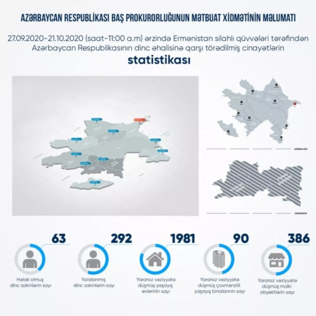 - Число погибших среди гражданского населения в результате обстрела вооруженными силами Армении населенных пунктов Азербайджана из тяжелых артиллерийских установок и ракетных систем с 27 сентября до 11:00 часов 21 октября достигло 63, а пострадавших – 292. Пришли в негодность 1981 дом, 90 многоквартирных зданий и 386 гражданских объектов. Информацию об этом распространила Генеральная прокуратура Азербайджанской Республики.