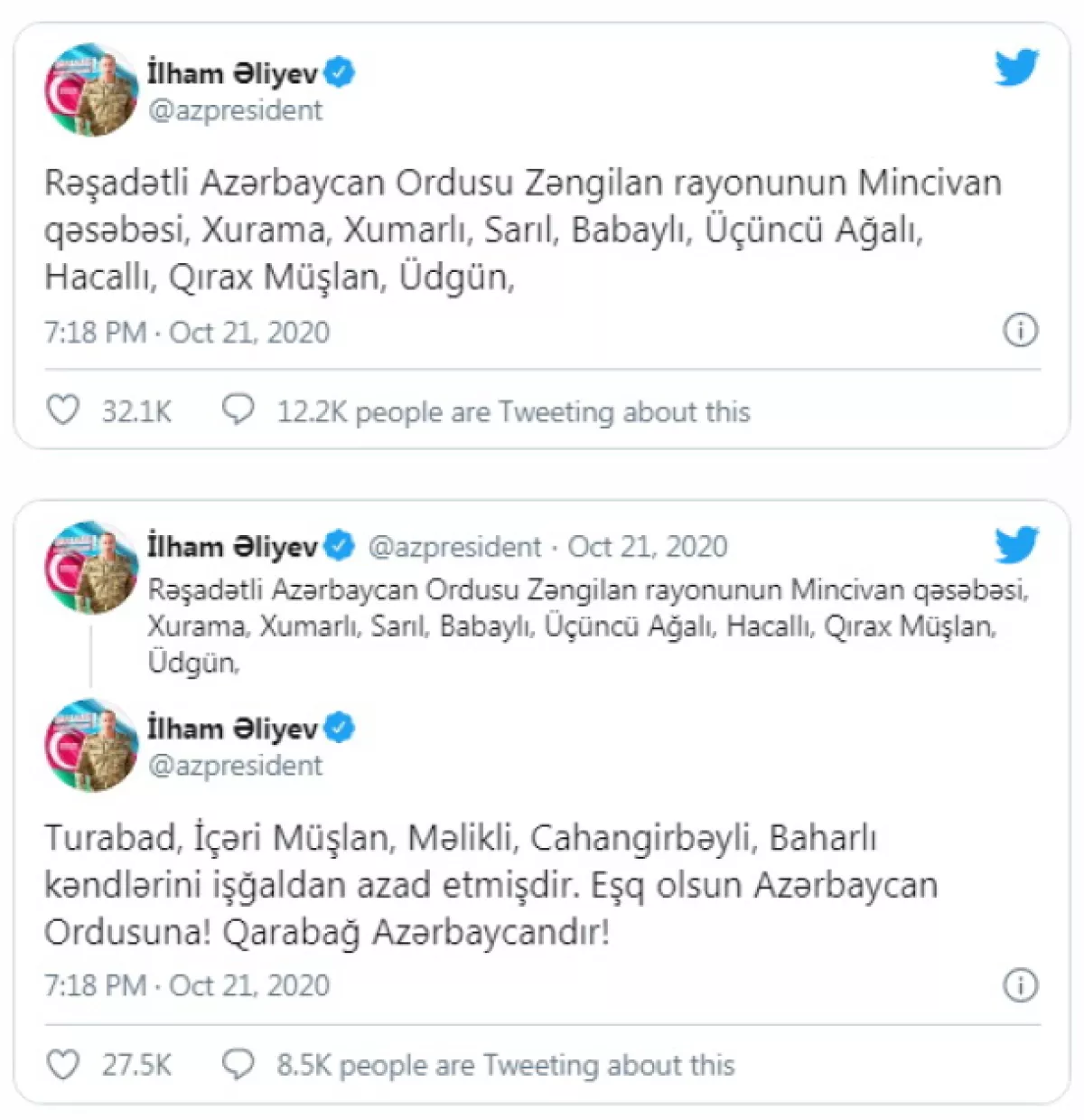 - Азербайджанская армия освободила от оккупации села Геджегёзлю, Ашагы Сеидахмедли, Зергер Физулинского района, а также села Балъянд, Папы, Тулус, Гаджилы, Тинли Джебраильского района. Об этом в своем аккаунте в Twitter сообщил Президент Ильхам Алиев.