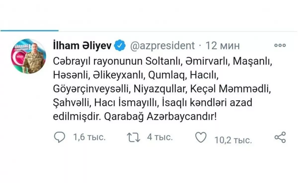 Освобождены села Солтанлы, Амирварлы, Машанлы, Гасанлы, Аликейханлы, Гумлаг, Гаджилы, Гёярчинвейселли, Ниязгуллар, Кечал Мамедли, Шахвелли, Гаджи Исмаиллы, Исаглы Джебраильского района. Об этом в своем аккаунте в Twitter написал Президент Ильхам Алиев.