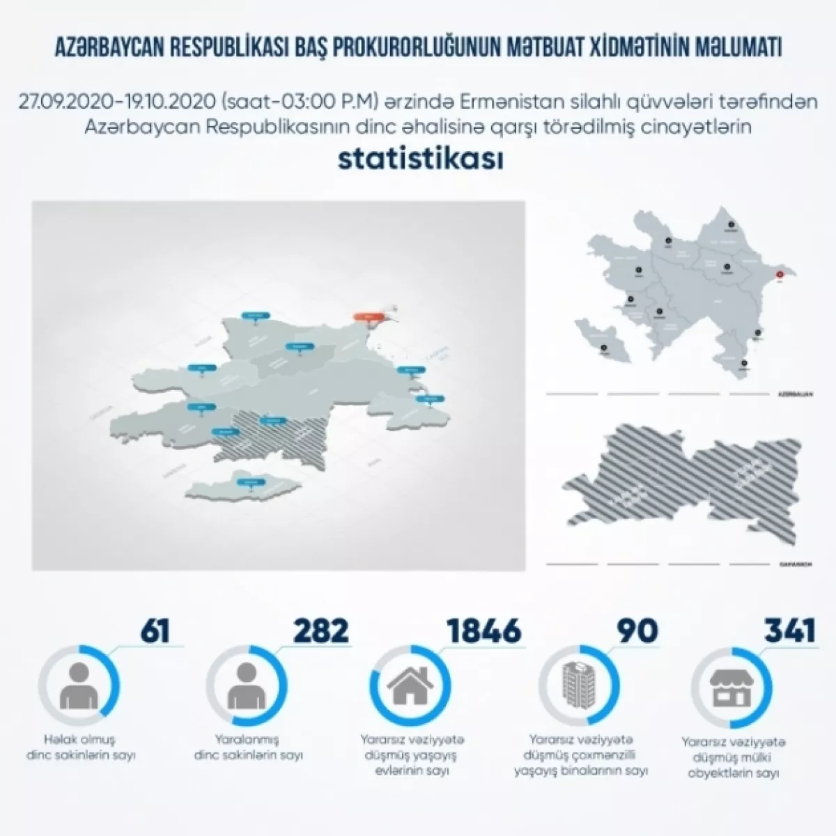По информации Генеральной прокуратуры, в результате обстрела вооруженными силами Армении населенных пунктов Азербайджана из тяжелых артиллерийских установок и ракетных систем по состоянию на 15:00 часов 19 октября погиб 61 мирный житель, пострадали 282 человека, пришли в непригодное состояние 1846 домов, 90 многоквартирных зданий и 341 гражданский объект.
