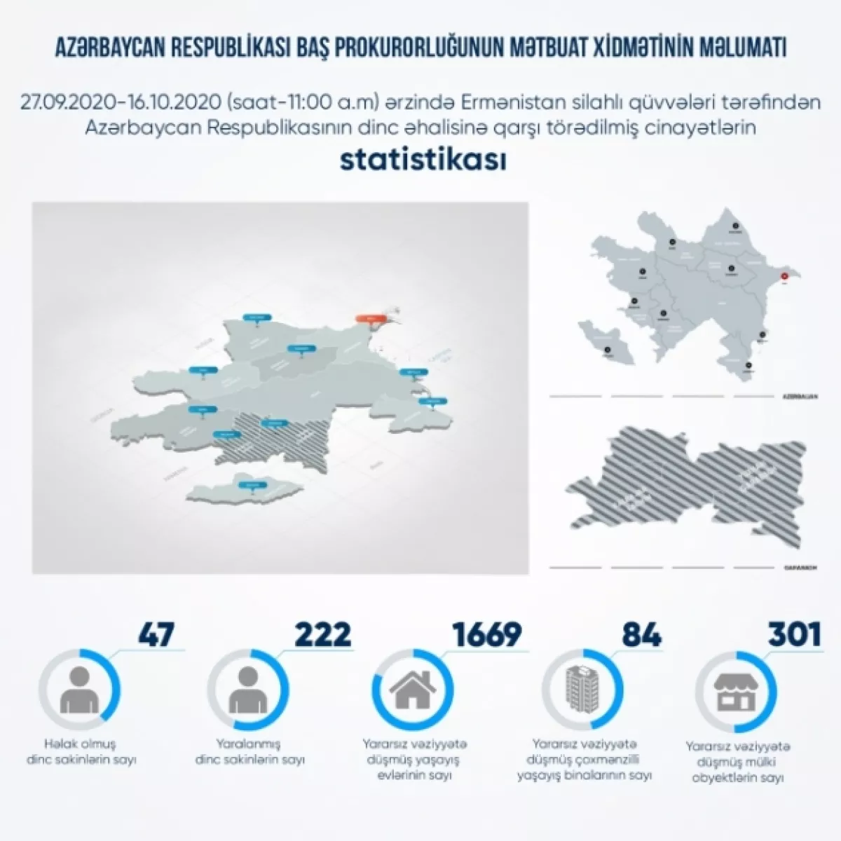 С 27 сентября до 11:00 16 октября в результате обстрелов вооруженными силами Армении наших населенных пунктов из тяжелых артиллерийских установок и ракетных систем число погибших среди гражданского населения достигло 47, а пострадавших - 222, нанесен ущерб 1669 домам, 84 многоквартирным зданиям и 301 гражданскому объекту. Об этом сообщила Генеральная прокуратура.