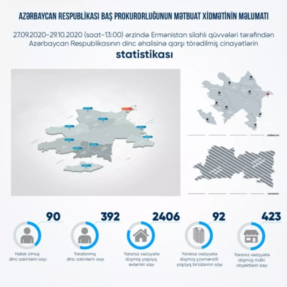 - Число погибших среди гражданского населения в результате террористических атак Армении с 27 сентября достигло 90, а пострадавших – 392. Информацию об этом распространила Генеральная прокуратура Азербайджана.