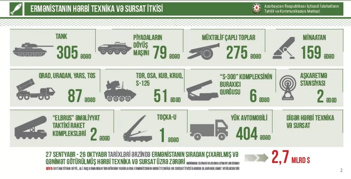 - Азербайджанская армия, начав 27 сентября успешную контрнаступательную атаку в ответ на широкомасштабную провокацию вооруженных сил Армении, до сих пор уничтожила и захватила в качестве трофеев значительное количество вражеской военной техники и боеприпасов. Общие потери врага оцениваются в 2,7 миллиарда долларов – инфографика.