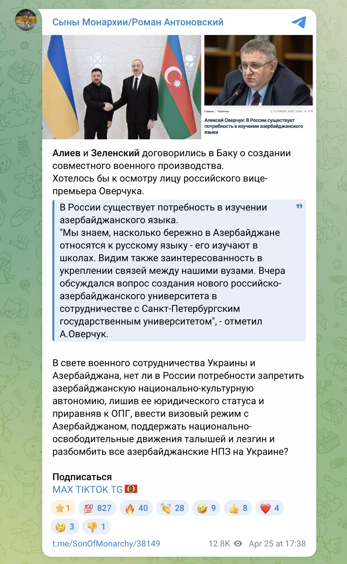 Тем не менее, в Z-сегменте русскоязычного Телеграма от этой новости сорвало предохранители. Не у одного автора — у целого пласта одновременно. У Романа Антоновского, чей канал «Сыны монархии» насчитывает 86 тысяч подписчиков, после новости о визите вышел пост, начинающийся словами «Встретились два лютых русофоба» и заканчивающийся прямой непристойностью — и собравшее за несколько часов сотни положительных откликов.