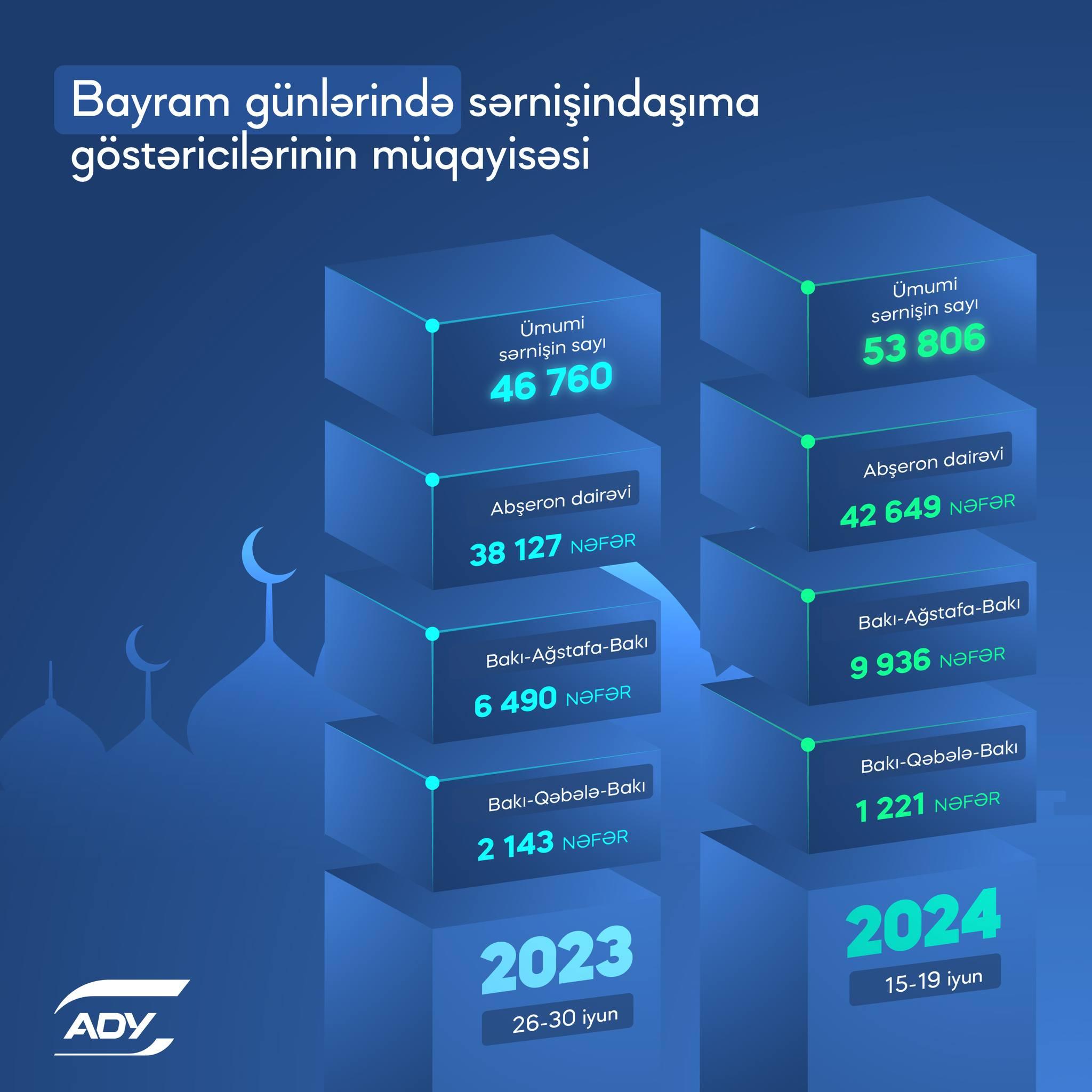 Кроме того, в праздничные дни значительно вырос пассажиропоток. Так, было перевезено 53 806 пассажиров, в том числе 42 649 по Бакинской окружной дороге, что заметно больше, чем в аналогичные праздничные дни 2023 года, когда было перевезено, соответственно, 46 760 и 38 127 пассажиров.