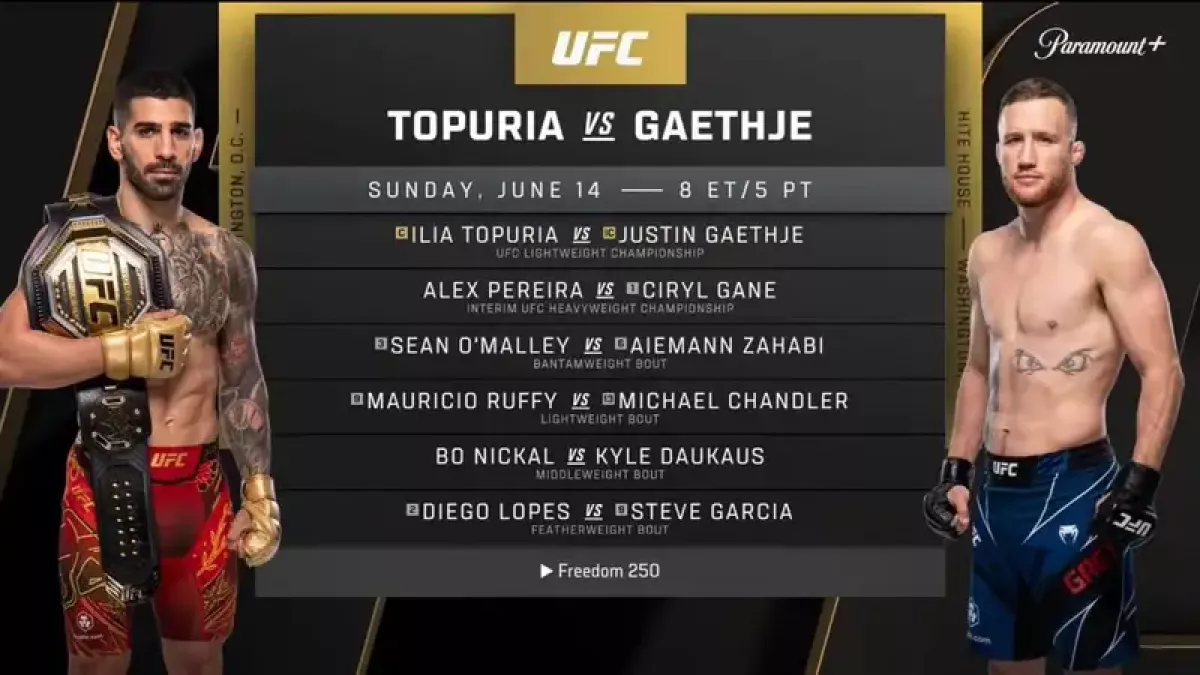 Стало официально известно, что главным событием турнира UFC, который состоится 14 июня в Белом доме, станет титульный бой в лёгком весе между американцем Джастином Гэтжи и испано-грузинским бойцом Илией Топурией.
