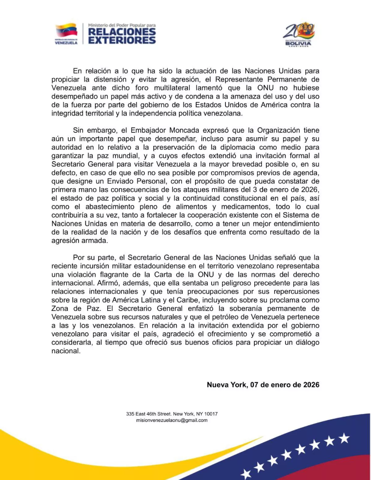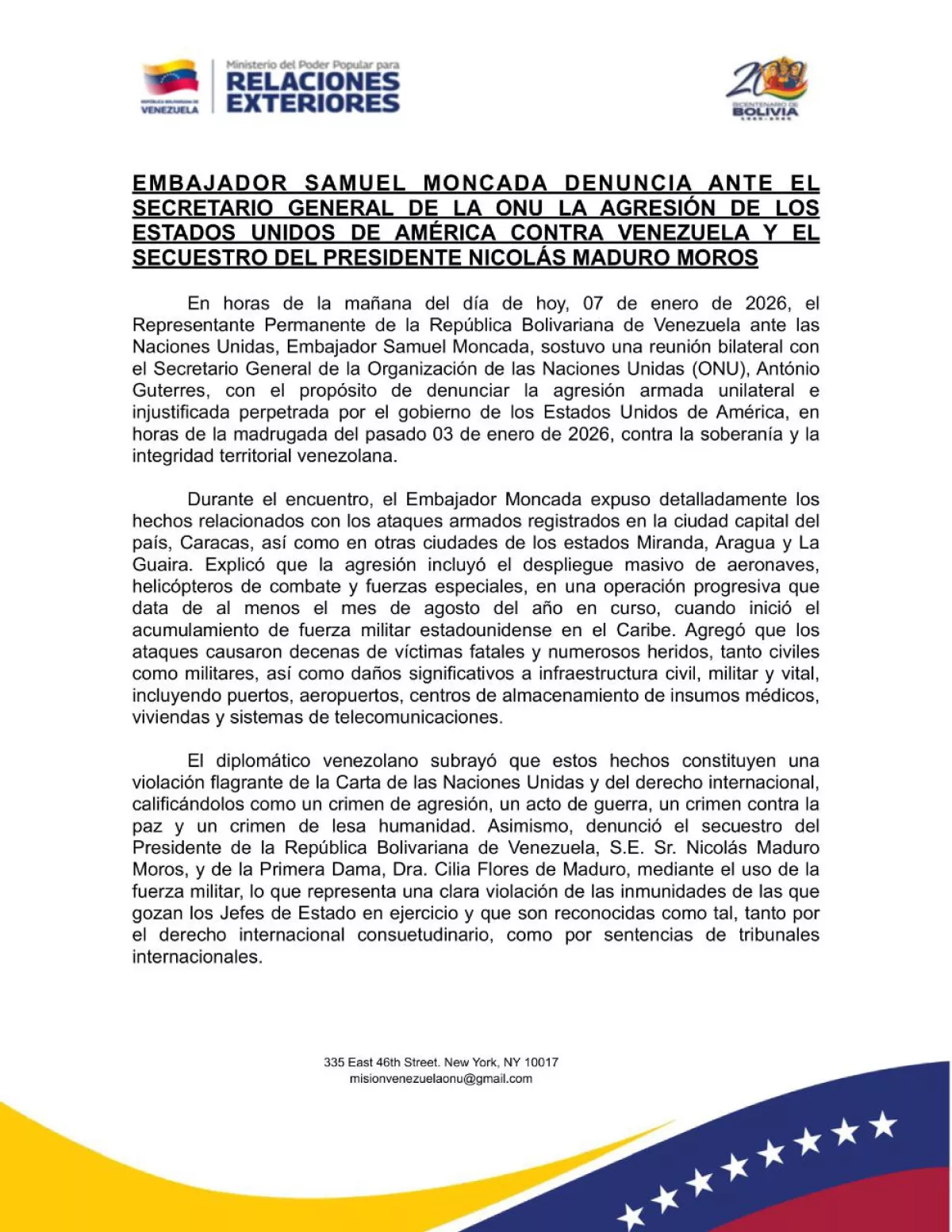 В утренние часы 7 января 2026 года Постоянный представитель Боливарианской Республики Венесуэла при Организации Объединённых Наций, посол Самуэль Монкада, провёл двустороннюю встречу с Генеральным секретарём ООН Антониу Гутерришем.