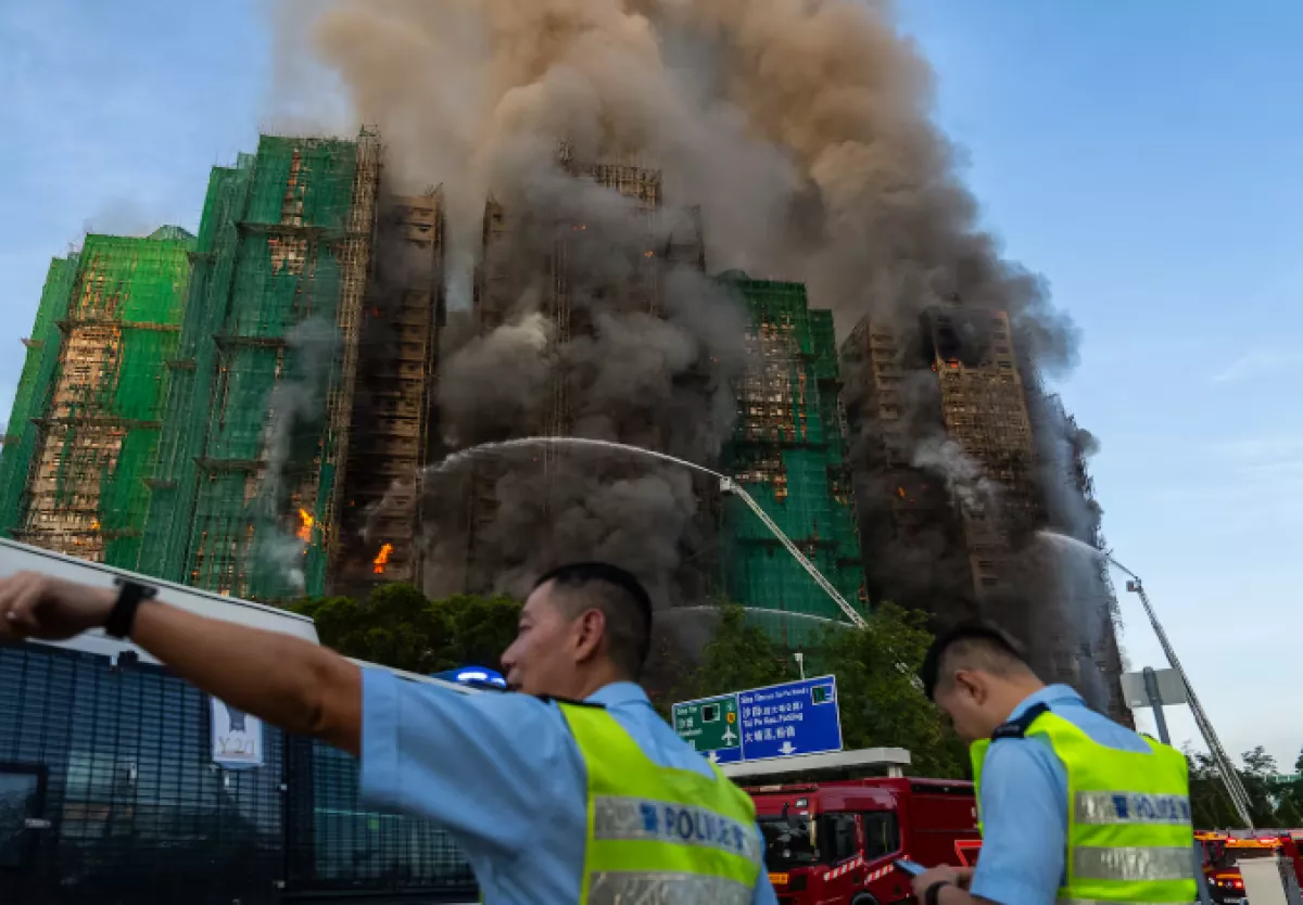 Бушующий пожар поднял столб пламени и густого дыма, распространяясь по бамбуковым лесам, установленным вокруг комплекса в районе Тай По. Прямая трансляция с места происшествия показала, как пожарные с высоких автолестниц направляют воду на тушение сильного пламени.