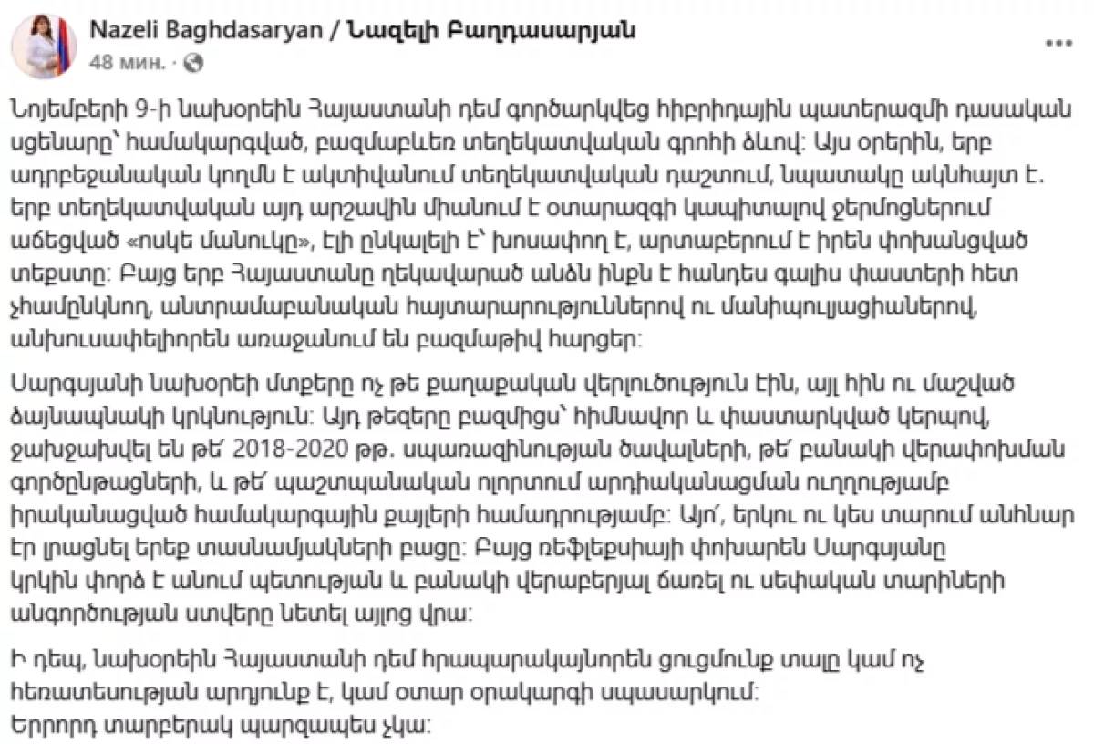 Кстати, публичное выступление накануне 9 ноября против Армении — либо результат недальновидности, либо служение чужой повестке. Третьего варианта просто нет», — написала Багдасарян.