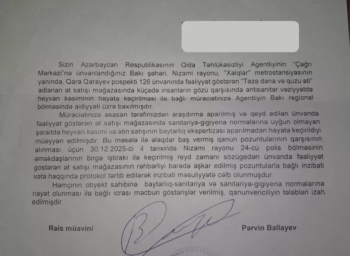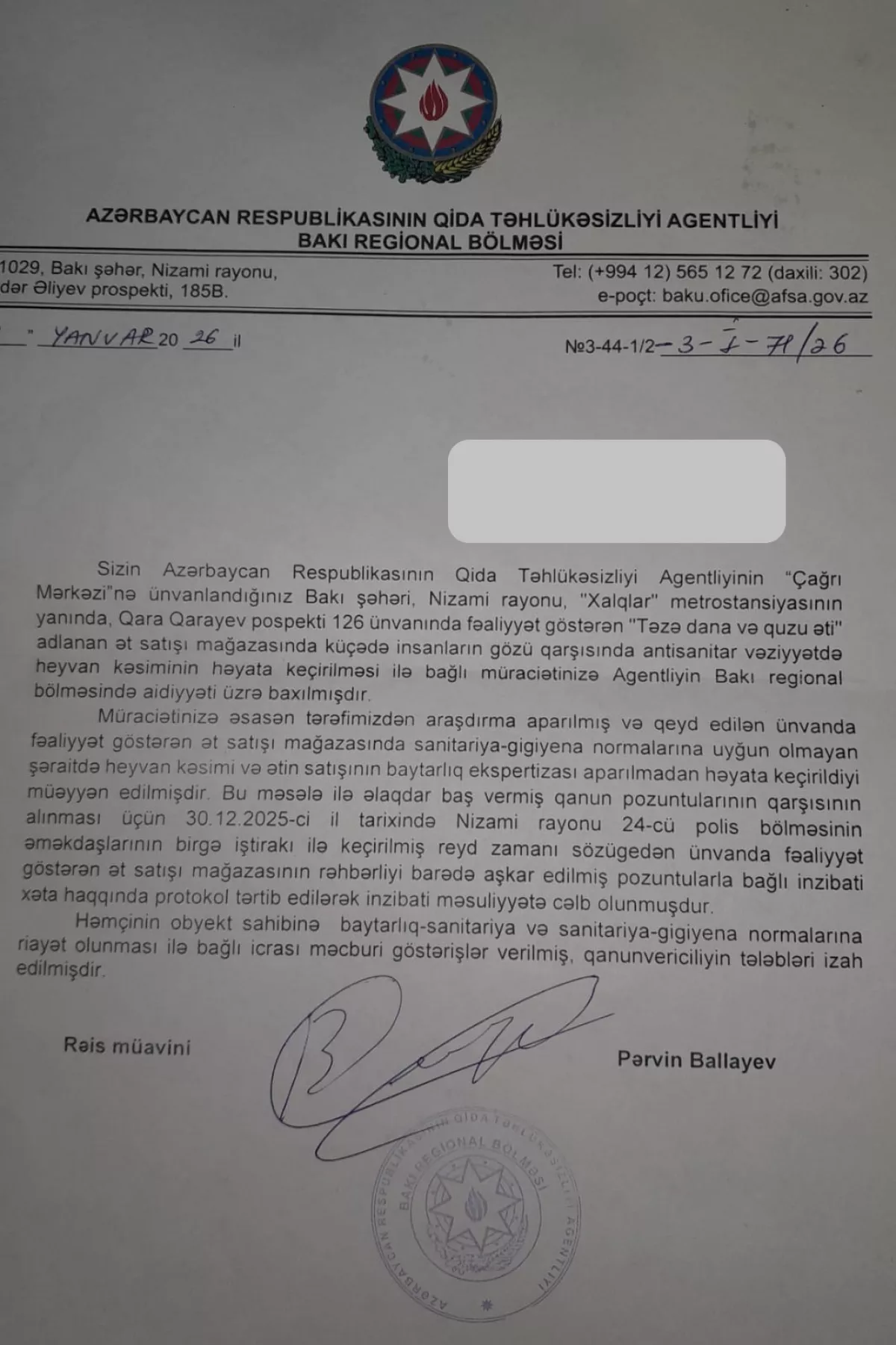 Caliber.Az благодарит Агентство продовольственной безопасности за оперативную реакцию и решение проблемы граждан.