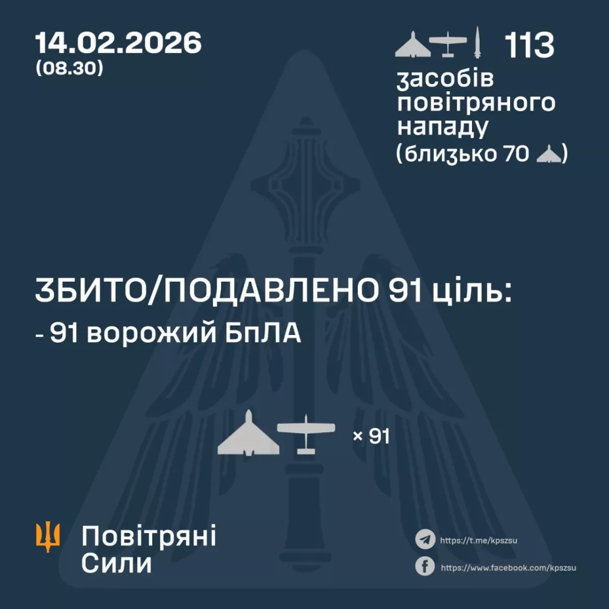 По предварительным данным на утро 14 февраля, ПВО сбила или подавила 91 БПЛА различных типов. Зафиксированы попадания 18 ударных дронов по 11 объектам, а обломки сбитых аппаратов упали на двух локациях.