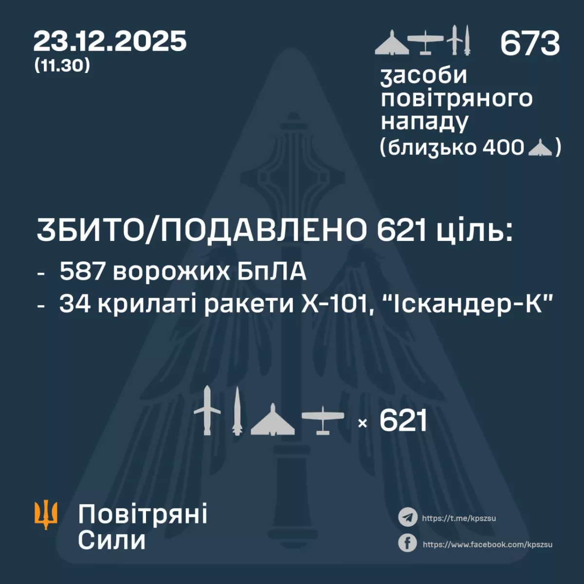 Украинская авиация, ЗРВ, подразделения РЭБ и мобильные огневые группы успешно отражали атаки. По предварительным данным, на утро 23 декабря ПВО уничтожила или подавила 621 воздушную цель: 587 БПЛА и 34 крылатые ракеты. Зафиксированы попадания в 21 локации, падения сбитых средств – на 8 локациях. Три «Кинжала» не достигли целей – места падения уточняются.