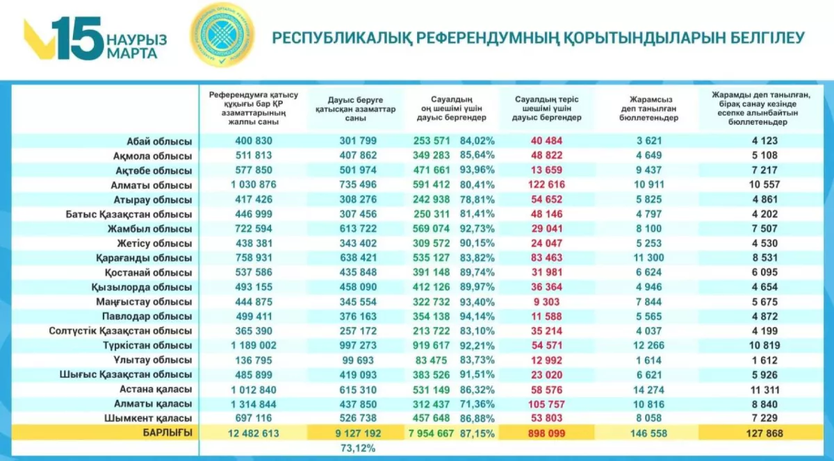 «Референдум по вопросу "Принимаете ли Вы новую Конституцию Республики Казахстан, проект которой опубликован в средствах массовой информации 12 февраля 2026 года?" считать состоявшимся, поскольку в голосовании приняло участие более половины, или 73,12 процента граждан, имеющих право участвовать в референдуме», — говорится в сообщении.