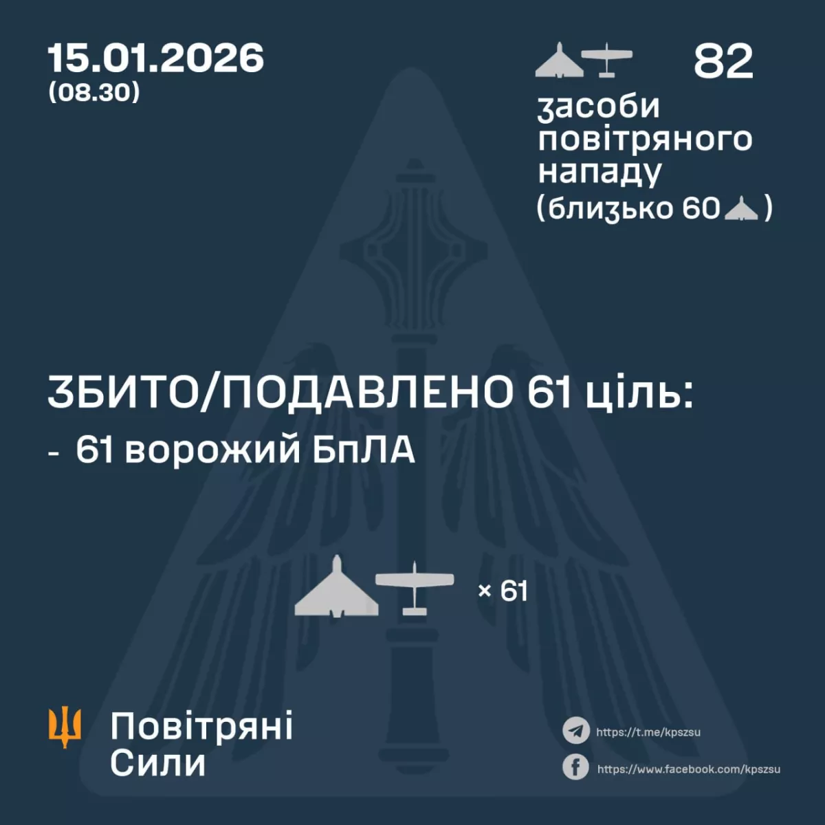 В ночь на 15 января РФ осуществила авиационную атаку с использованием 82 ударных беспилотников типа «Shahed», «Гербера», «Итальмас» и других моделей. Из них около 60 дронов были типа «шахед».