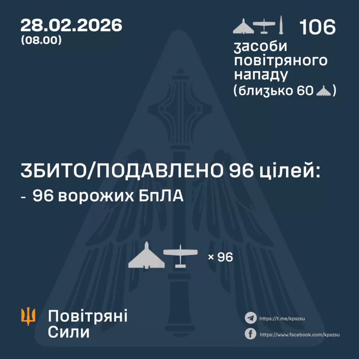 В ночь на 28 февраля Россия атаковала баллистической ракетой «Искандер-М», а также 133 ударными БПЛА типов «Шахед», «Гербера», «Италмас» и других. Около 60 из них — «Шахеды».