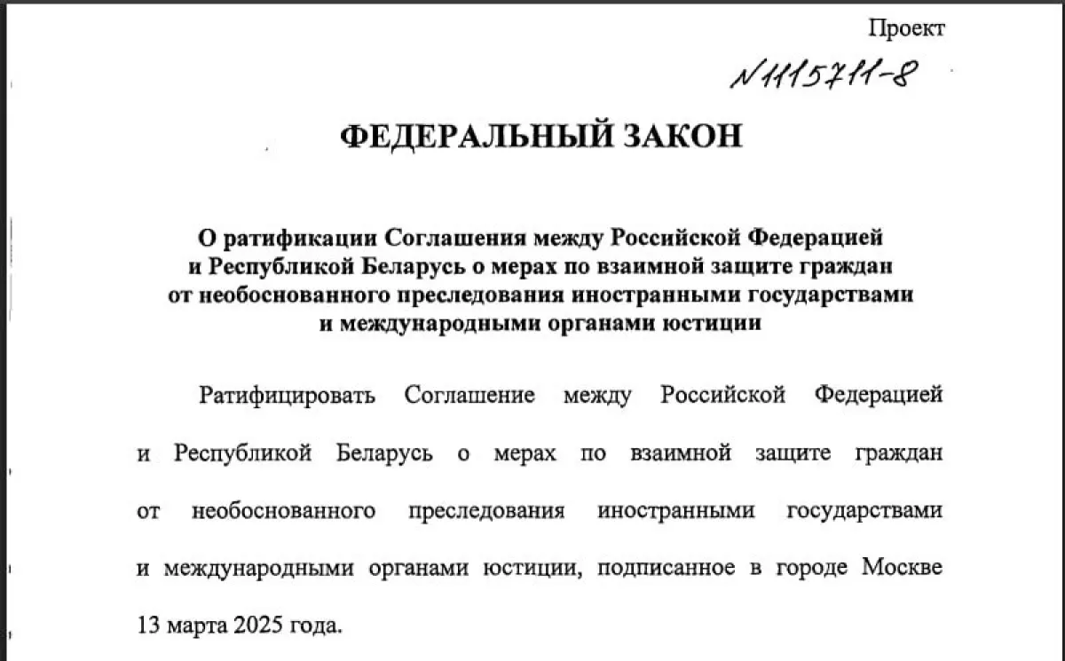 Как пишет «Слово о защите», само соглашение было подписано еще в марте 2025 года. По нему Россия и Беларусь отказываются исполнять запросы о выдаче, аресте или других мерах, которые поступают от третьих стран или международных судов в отношении граждан двух стран.