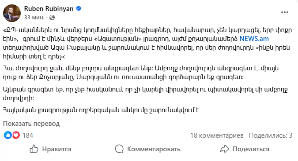 Как передает Caliber.Az, соответствующий пост Рубен Рубинян опубликовал на своей странице в Facebook.