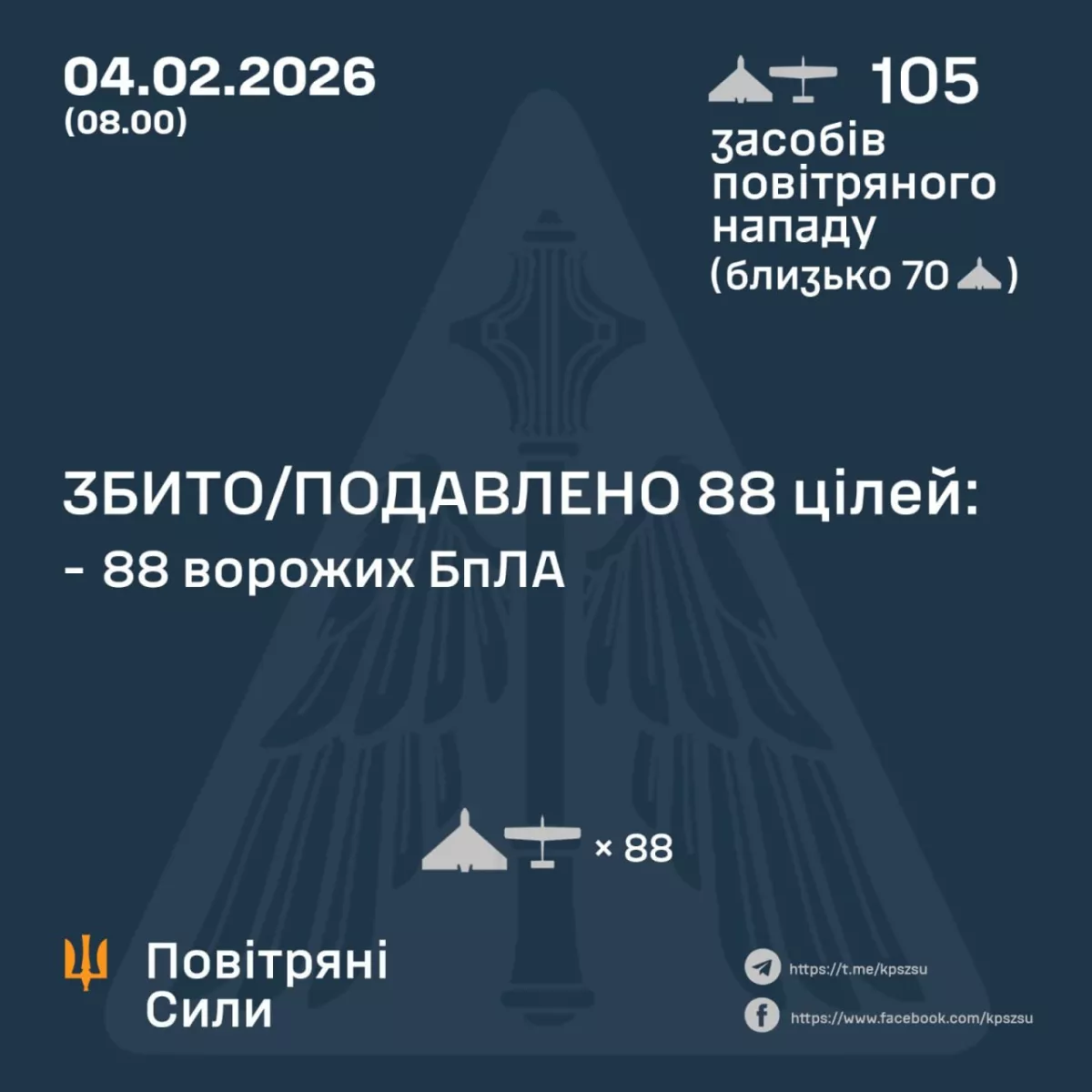 Украинские силы обороны, включая авиацию, зенитные ракетные войска, подразделения РЭБ, мобильные огневые группы и системы ПВО, успешно отразили атаку. По предварительным данным, на 08:00 (по местному времени) 4 февраля было сбито или подавлено 88 российских БПЛА.