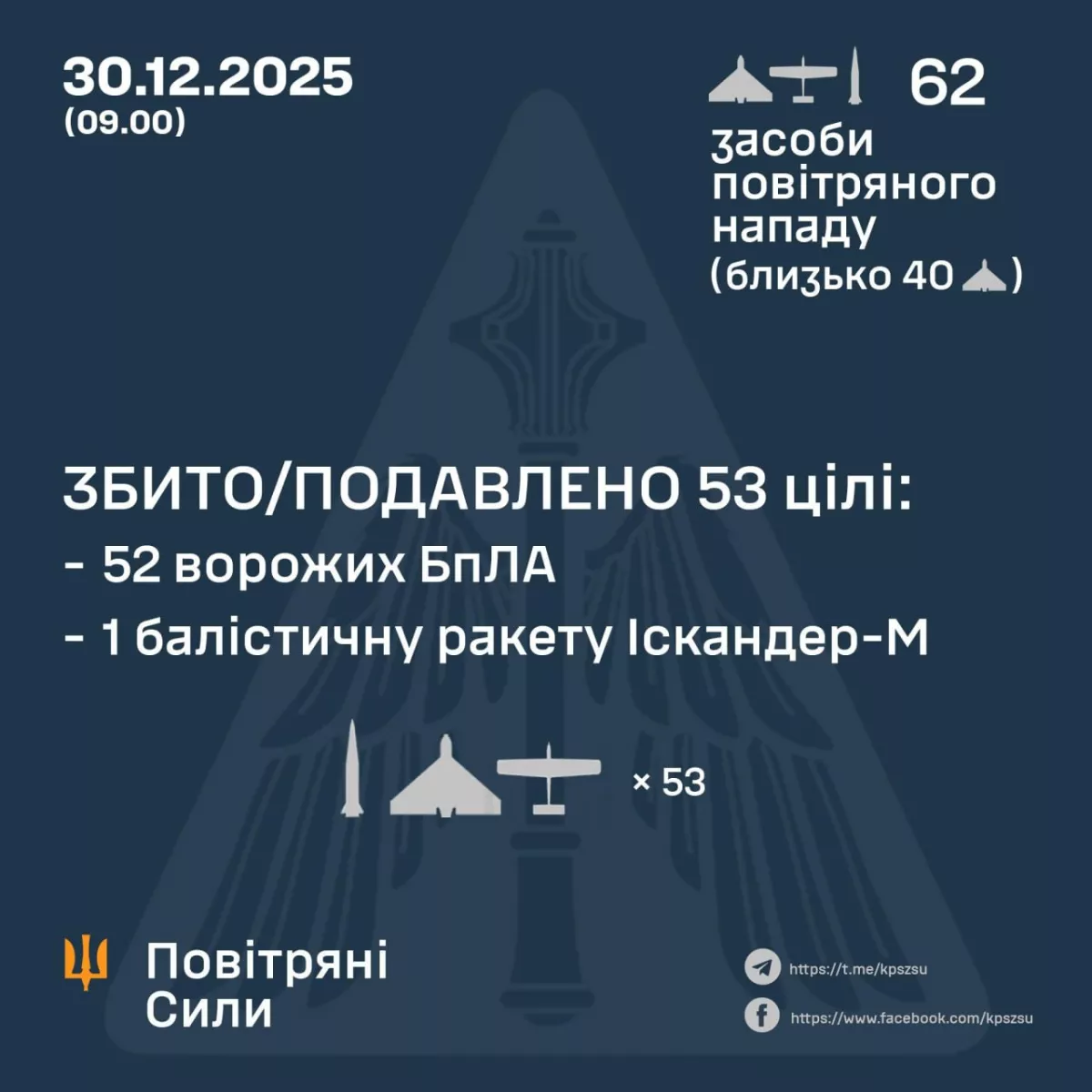 В ночь на 30 декабря Россия атаковала Украину двумя баллистическими ракетами «Искандер-М» с территории Крыма и Воронежской области, а также около 60 ударными БПЛА типов Shahed, «Гербера» и другими, запущенными с направлений Орёл, Брянск, Курск, Приморско-Ахтарск (Россия) и Гвардейское, Чауда (Крым). Около 40 из них — «шахеды».