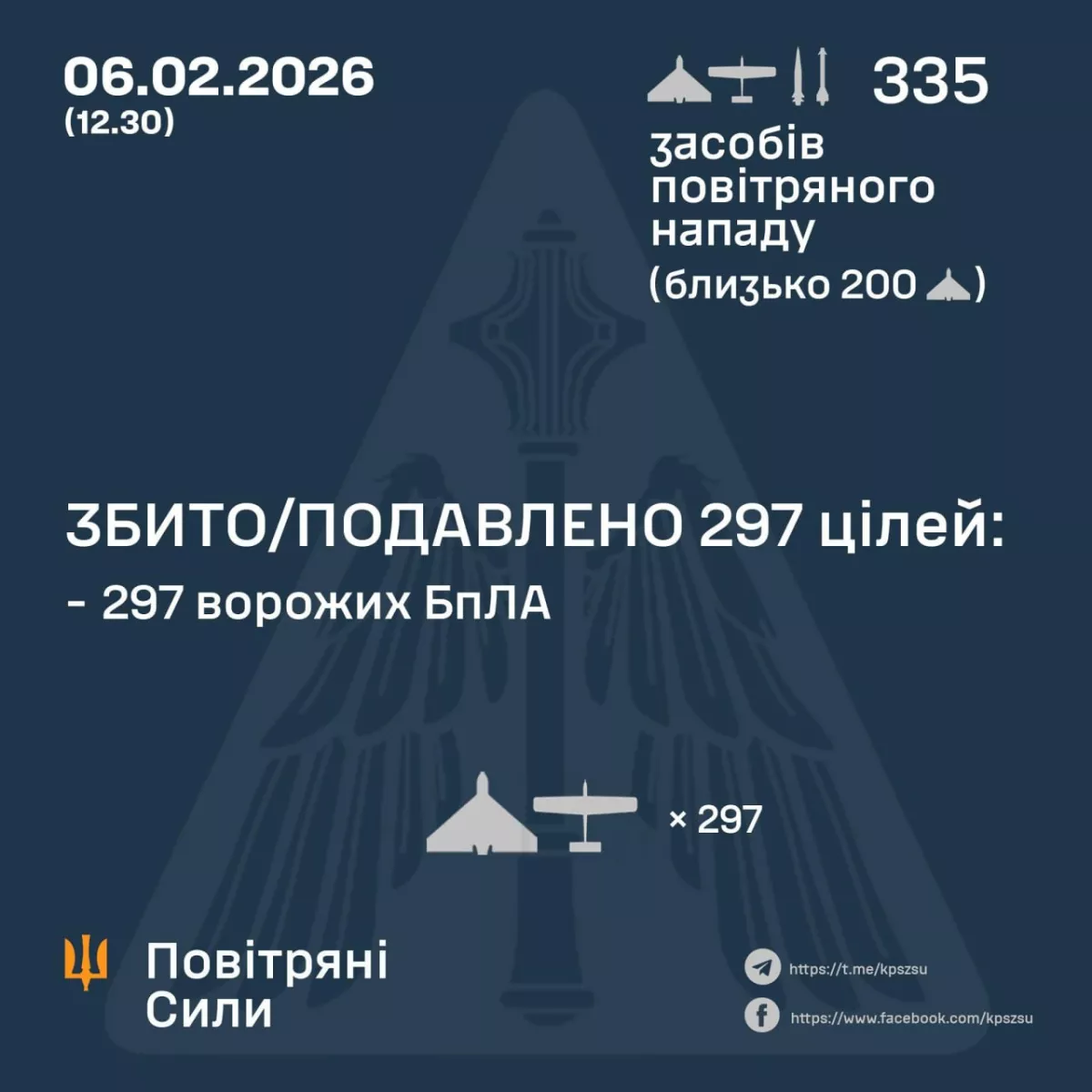 В ночь на 6 февраля и утром того же дня силы РФ атаковали Украину 328 ударными дронами, включая «Шахед», «Гербера» и «Итальмас», а также выпустили 2 аэробаллистические ракеты «Кинжал» и 5 управляемых авиационных ракет Х-59/69. Около 200 атакующих дронов были «Шахедами».