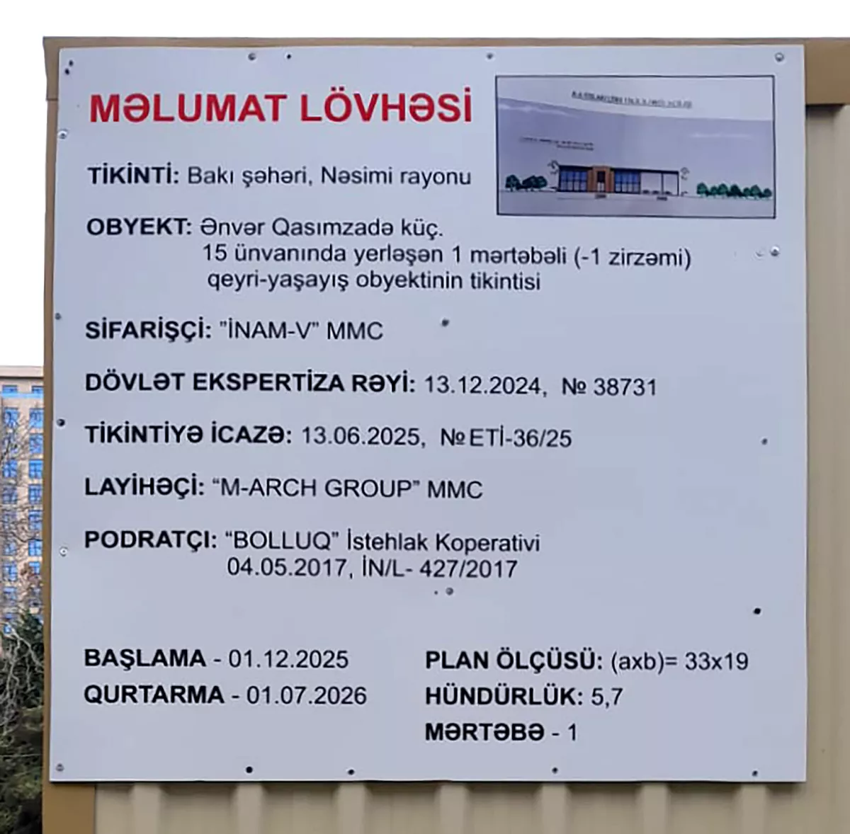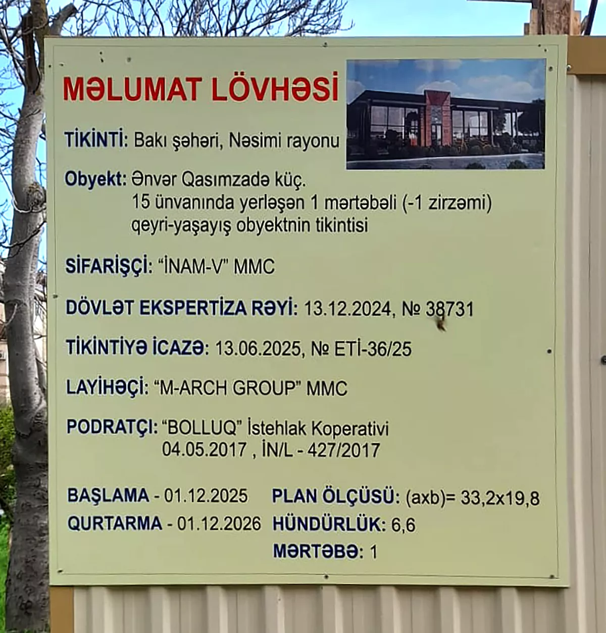 На указанной территории 13 июня 2025 года было выдано разрешение на строительство одноэтажного нежилого объекта с подвалом. Разрешение выдано Главным управлением архитектуры и градостроительства города Баку при Государственном Комитете по градостроительству и архитектуре Азербайджана в установленном законодательством порядке, на основании заключений соответствующих государственных органов.