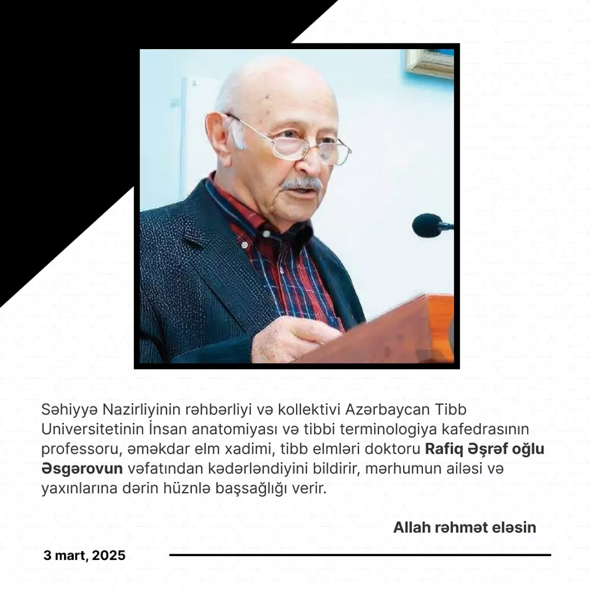 Скончался профессор кафедры Анатомии человека и медицинских терминов Азербайджанского медицинского университета (АМУ), доктор медицинских наук, заслуженный деятель науки Рафиг Ашраф оглу Аскеров.