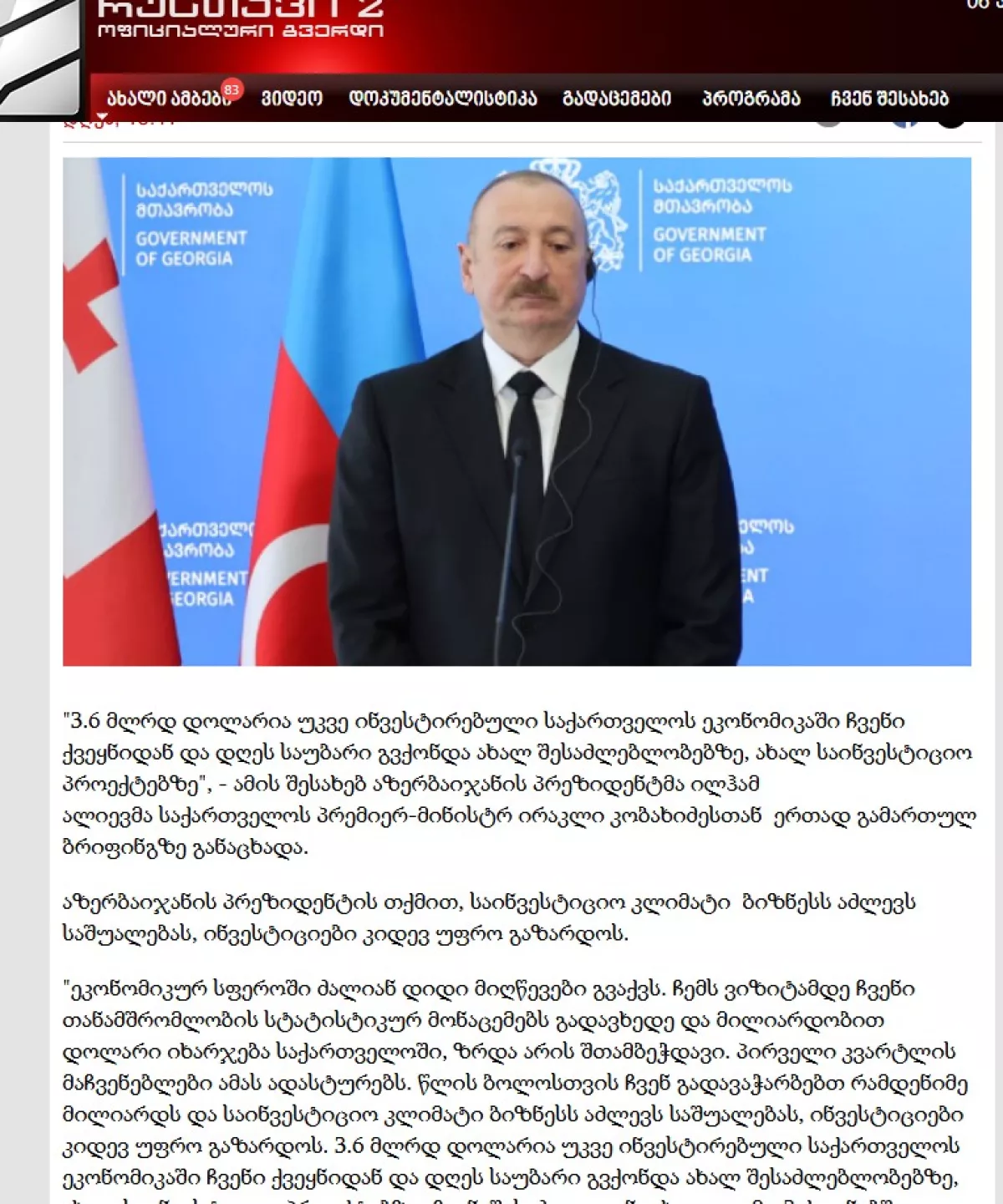 Primitime.ge пишет, что в выступлении президента Азербайджана было выражено удовлетворение более динамичным развитием отношений между двумя странами. Сообщается, что Азербайджан и Грузия поддерживают территориальную целостность, суверенитет и неприкосновенность границ друг друга во всех международных организациях. Так было всегда и так будет в будущем.