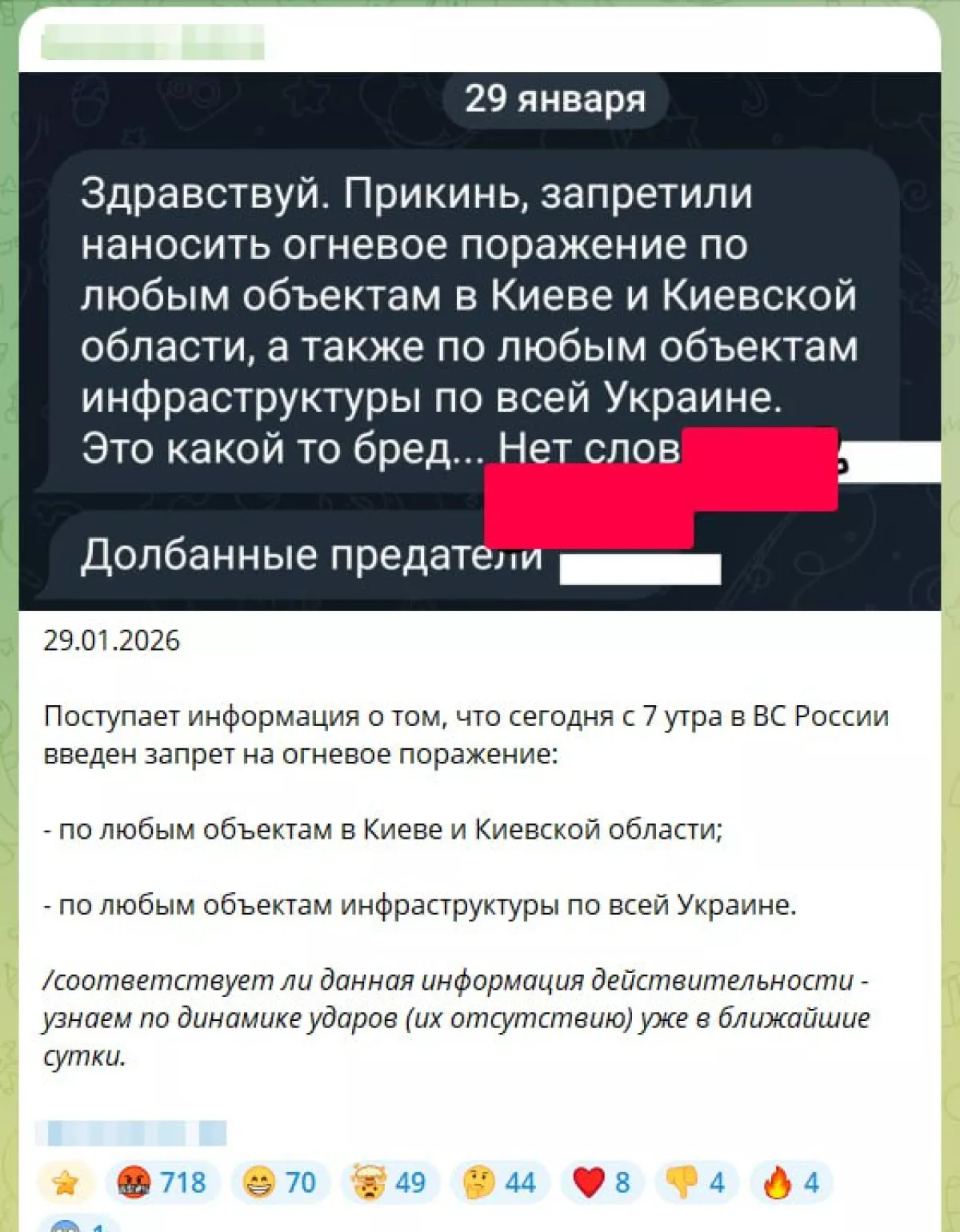 В украинских Telegram-каналах появилась информация о том, что якобы с сегодняшнего дня, с 7:00 утра (по мск времени), в Вооружённых силах РФ введён запрет на огневое поражение любых объектов в Киеве и Киевской области, а также объектов инфраструктуры по всей территории Украины.