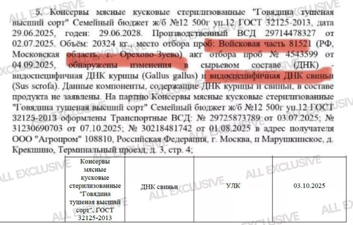 В распоряжении All Exclusive также оказались документы, согласно которым осенью 2025 года поставки этой тушенки шли не только в столовые российской армии, но и на экспорт в целый ряд стран Центральной Азии, большинство населения которых исповедует ислам. Для мусульман свинина является табуированным продуктом.