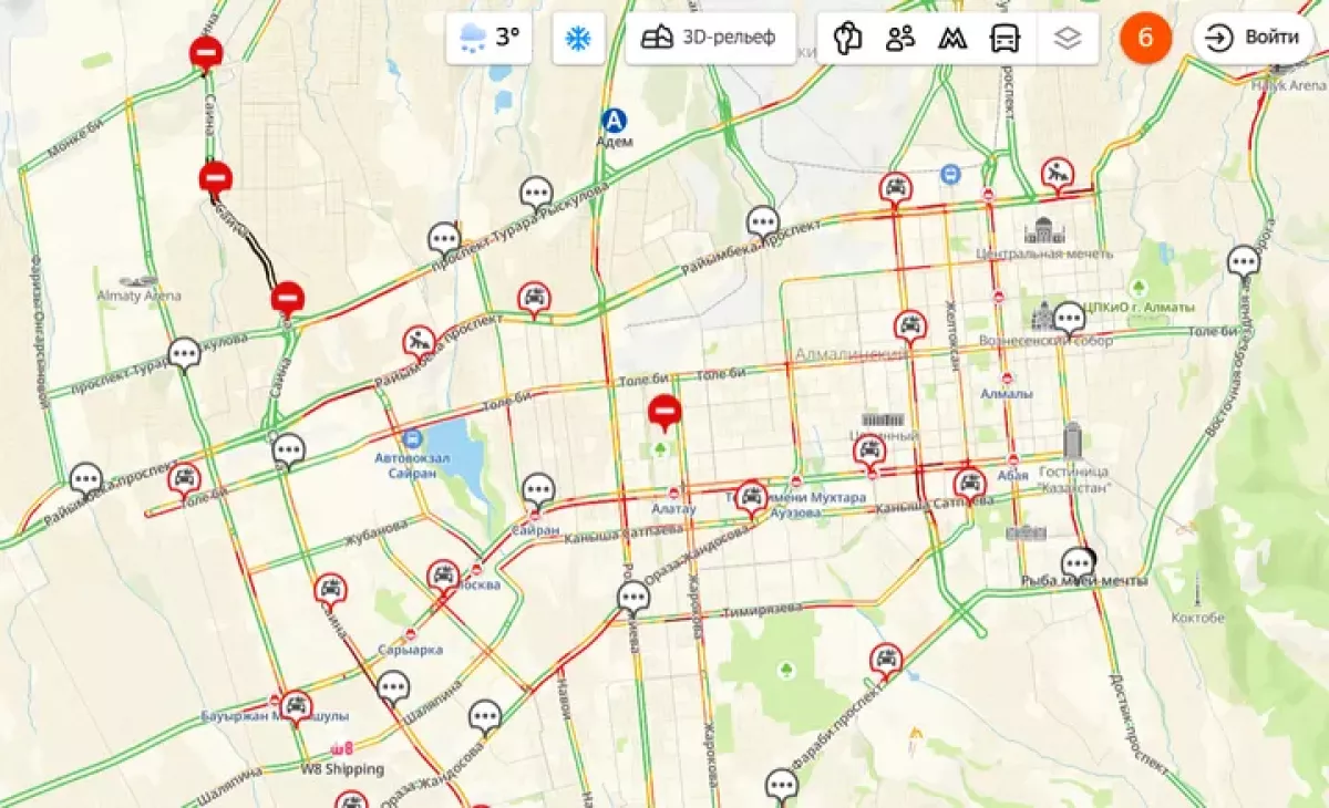 В Алматы (Казахстан) продолжается снегопад, во время которого в городе отмечаются заторы, водители жалуются на долгое время в пути, а на карте указано множество ДТП, передает NUR.KZ.