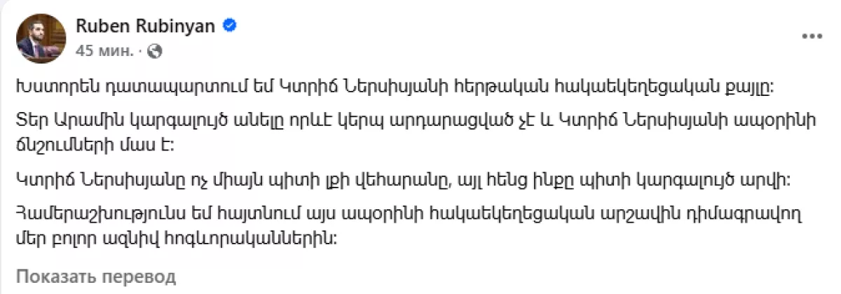 «Низвержение отца Арама никоим образом не оправдано и является частью незаконного давления, оказываемого Ктричем Нерсисяном (Гарегин II — ред.). Ктрич Нерсисян должен не только покинуть кафедру, но и сам быть низложен. Выражаю солидарность со всеми нашими честными священнослужителями, которые противостоят этой незаконной антицерковной кампании», — написал Рубинян.