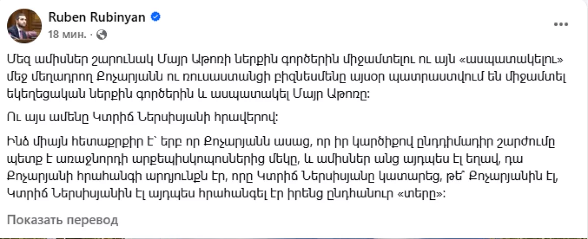 Меня интересует лишь одно: когда Кочарян заявил, что, по его мнению, оппозиционное движение должен возглавить один из архиепископов, и спустя месяцы именно так и произошло — было ли это результатом указания Кочаряна, выполненного Ктричем Нерсисяном, или же и Кочаряну, и Ктричу Нерсисяну такой указ дал их общий «хозяин»?», — написал Рубен Рубинян.