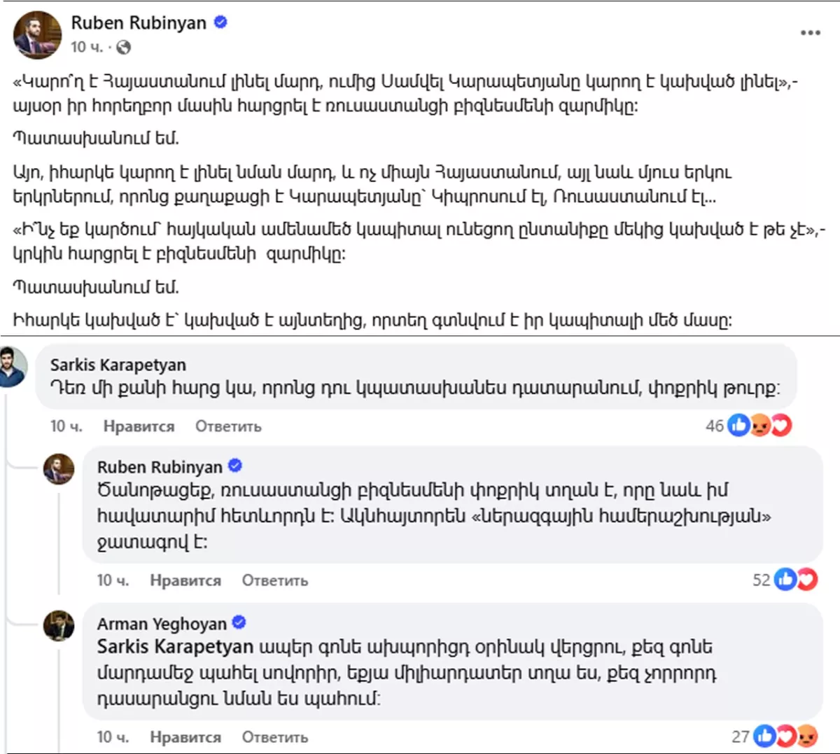Вчера вице-спикер парламента Армении Рубен Рубинян ответил на вопросы, которые в надежде на безответность ранее задавал племянник арестованного российского олигарха Самвела Карапетяна Нарек Карапетян.