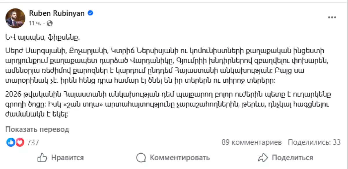 Все силы, борющиеся против независимости Армении, в 2026 году нужно отправить к чертовой матери. А тем, кто злоупотребляет выражением «сукин сын» (շան տղա), пожалуй, пора надеть намордник!» — написал в соцсетях Рубен Рубинян.