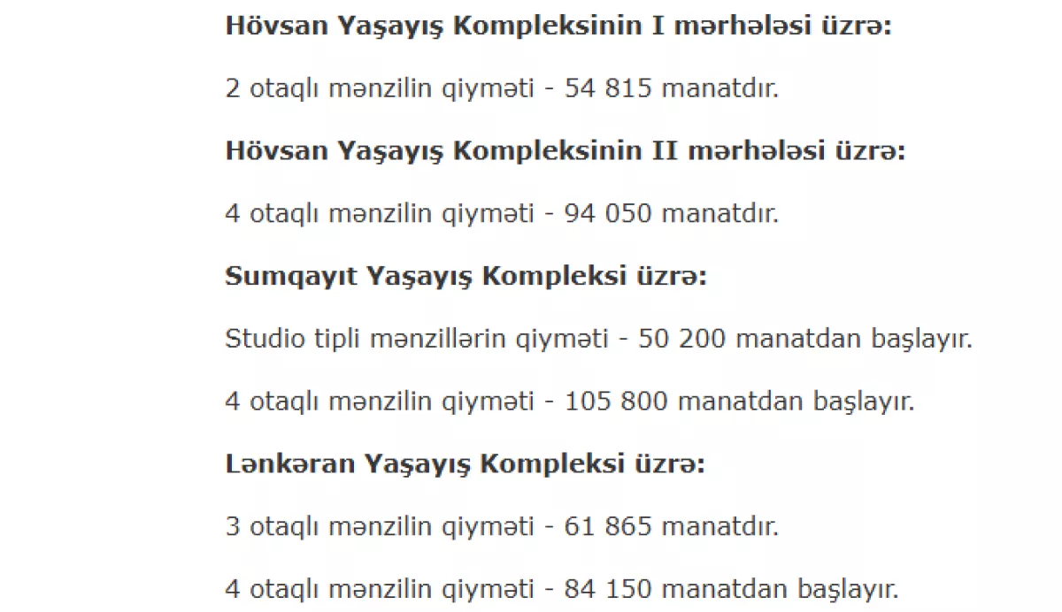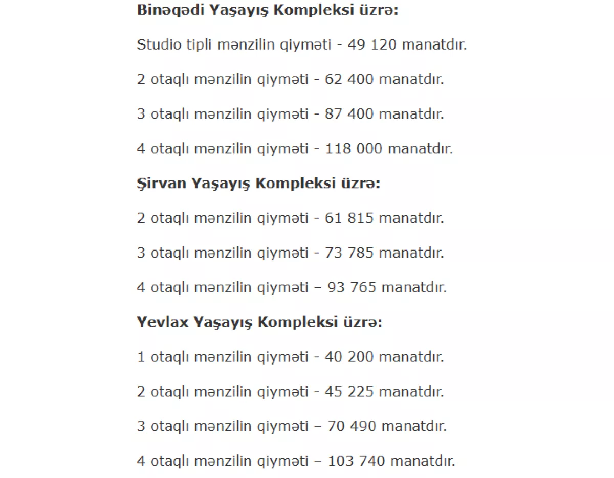 Государственное агентство жилищного строительства (MIDA) объявило о продаже льготных квартир в жилом комплексе Говсан (I и II этап), жилом комплексе Бинагади, а также в жилых комплексах Сумгайыта, Лянкярана, Ширвана и Евлаха.