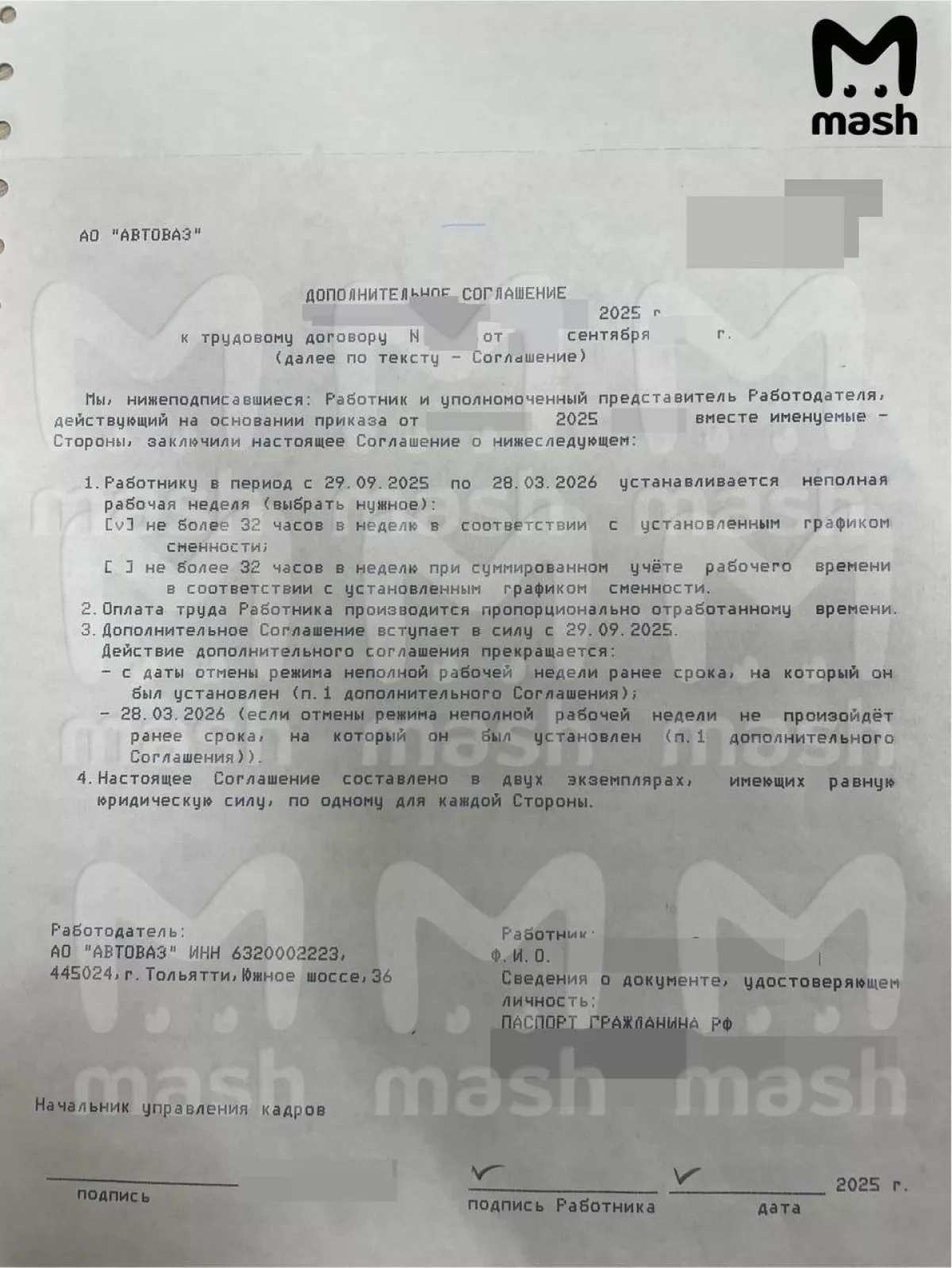 Летом рабочих обязали подписать допсоглашения о сокращённой неделе — премии и сверхурочные исчезли. «Раньше мы получали по 100–120 тысяч, теперь максимум 45–50. Чудес не бывает, стало понятно, что ничего хорошего ждать не стоит», — рассказывает Mash бывший сотрудник, приславший фото соглашения анонимно.