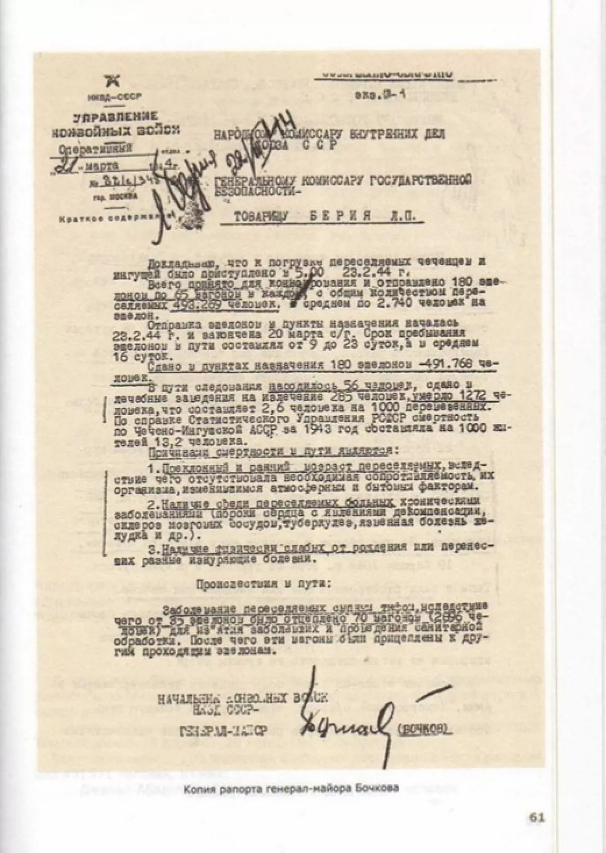 В частности, в рапорте генерал-майора Бочкова от 21 марта 1944 года Лаврентию Берии говорится: «Докладываю, что к погрузке переселяемых чеченцев и ингушей было приступлено в 5:00 23.02.44. Всего было принято для конвоирования и отправлено 180 эшелонов по 65 вагонов в каждом, с общим количеством переселяемых 493.269 человек. В среднем по 2.740 человек на эшелон. Отправка эшелонов в пункты назначения началась 23.2.44 и закончена 20 марта с/г».