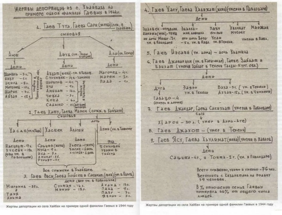 Весь ужас советской политики террора в отношении ингушей и чеченцев в этой книге представлен на примере большой семьи Гаевых из Хайбаха, из которой в живых остались всего 39 человек, 76 были убиты и заживо сожжены.