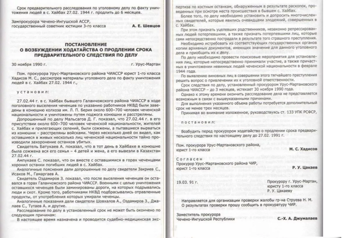Особой жестокостью отличились события, произошедшие в ауле Хайбах. Так, помощник прокурора Урус-Мартановского района ЧИАССР, юрист 1-го класса Хадисов М. С., рассмотрев материалы уголовного дела по факту уничтожения людей в с. Хайбах 27.02.1944 г., установил: «27.02.1944 г. в с. Хайбах бывшего Галанчожского района ЧИАССР в ходе поголовного выселения чеченцев по указанию работников НКВД в конюшню колхоза им. Л. П. Берия были загнаны около 600–700 человек чеченской национальности, которые были уничтожены путем поджога конюшни, а также расстреляны. Допрошенный по делу Мальсагов Д. Г. показал, что 27.02.1944 г. в его присутствии около 600–700 человек чеченской национальности, жителей с. Хайбах и прилегающих селений, были сожжены, а пытавшиеся вырваться из конюшни расстреляны войсками. Через несколько дней он видел, как оставшиеся в живых несколько лиц чеченской национальности тайно производили захоронение останков убитых. Свидетель Батукаев А. дал показание, что в тот день в Хайбахе в конюшне была сожжена вся его семья – жена и 4 детей, а его самого 27.02.1944 г. вывезли в Казахстан». [С. Гаев, M. Хадисов, Т. Чагаева. ХАЙБАХ: следствие продолжается. Нальчик, 2012. Стр. 159].