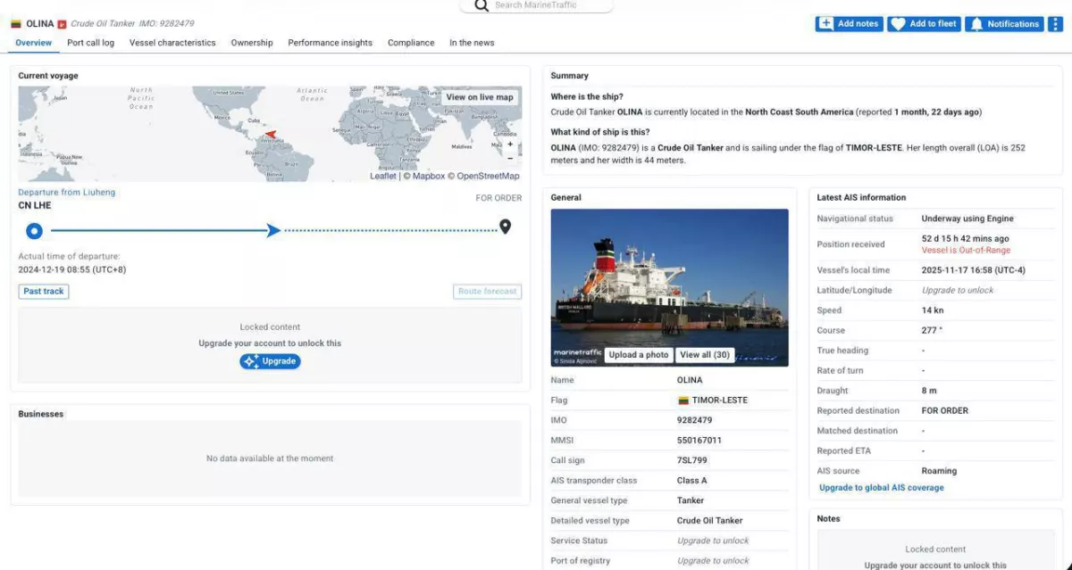 По данным источников и морских баз данных, танкер Olina ранее выходил из Венесуэлы и возвращался в регион, но при этом якобы нёс флаг Восточного Тимора, что характерно для так называемого «теневого флота» судов, избегающих санкций.