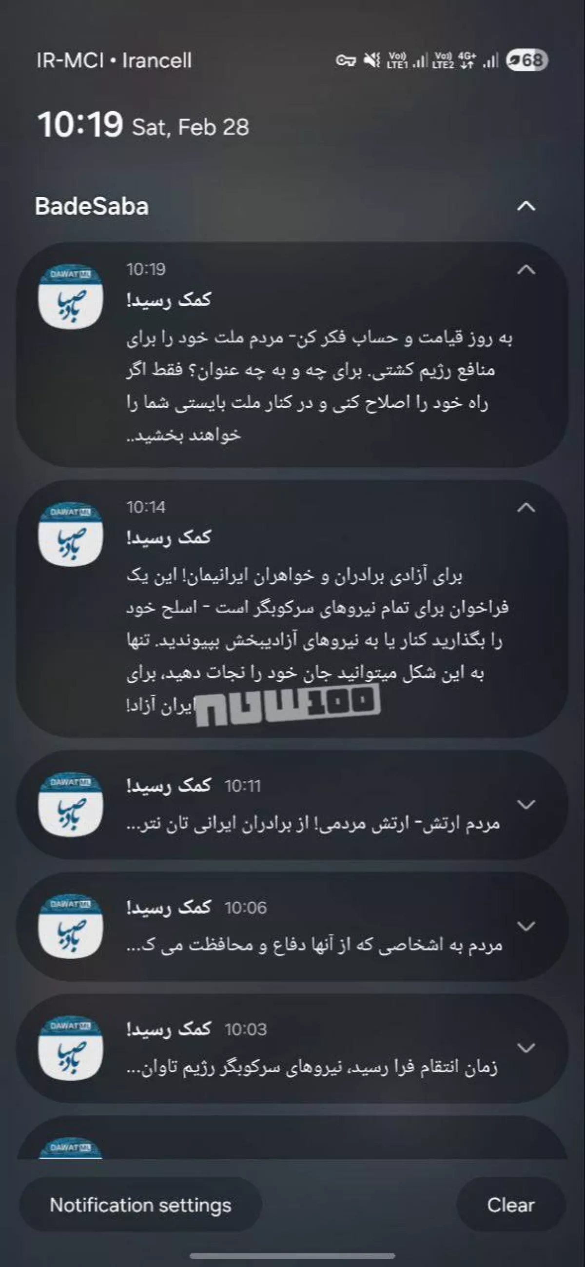 В ходе событий война перемещается и в цифровую сферу: пользователи в Иране сообщили о взломе популярного приложения «Бад Саба», используемого для отслеживания времени молитвы. Вместо привычных уведомлений граждане увидели сообщения в поддержку атаки и призывы против режима под заголовком «Помощь прибыла».