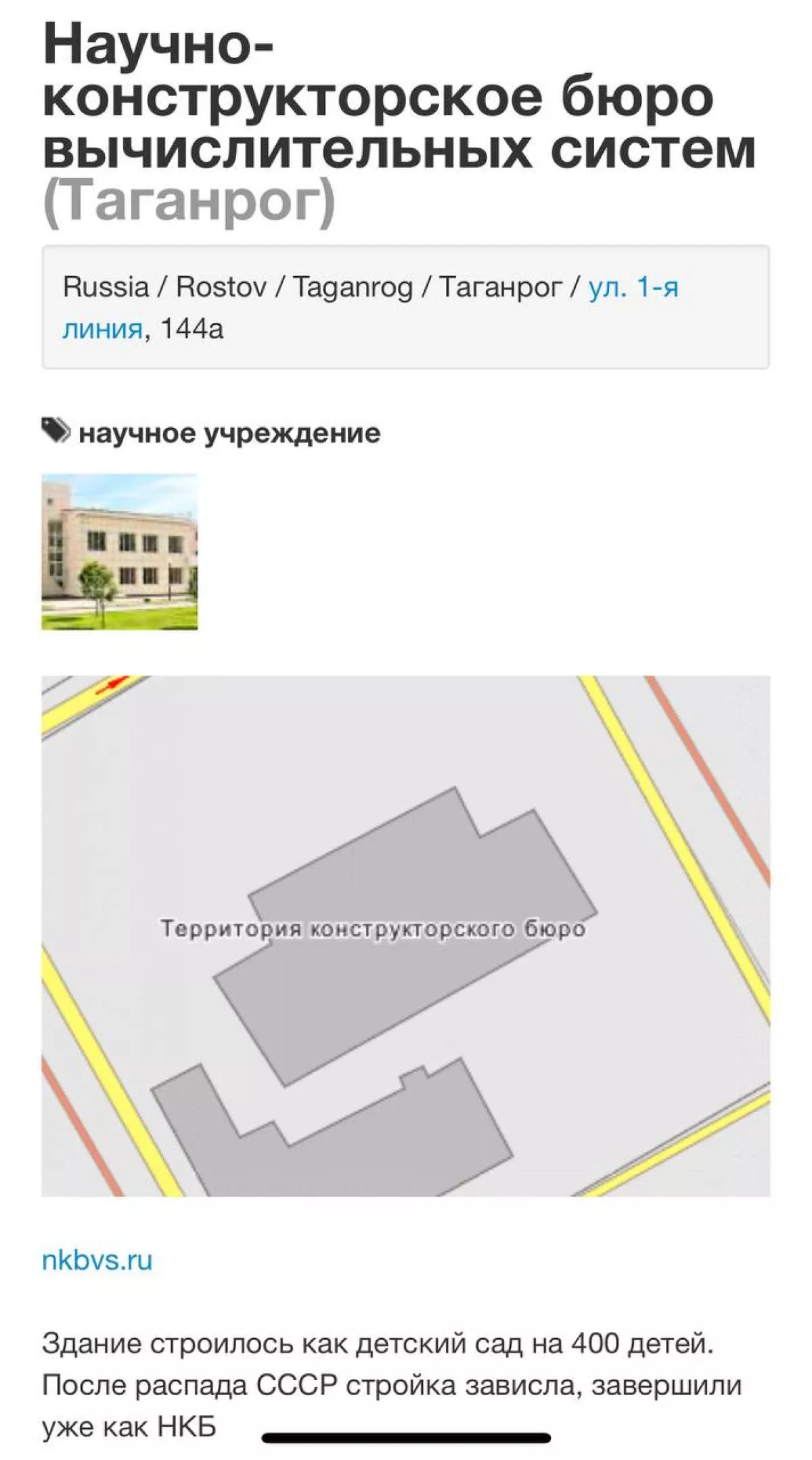 Как выяснила ASTRA, вторым атакованным объектом стало АО «Научно-конструкторское бюро вычислительных систем». На территорию предприятия, расположенного на улице 1-ой Линии, упал как минимум один беспилотник. Предприятие занимается разработкой встраиваемых электронных систем, высокотехнологичных вычислительных комплексов, программного обеспечения и интеллектуальных систем обработки данных и изображений для транспорта, робототехники, автоматизации и других высокотехнологичных отраслей.