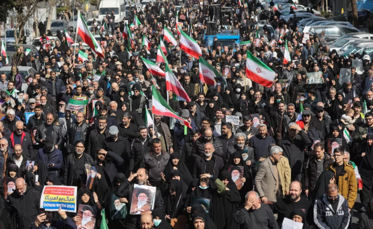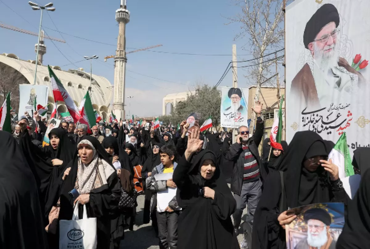 Сторонники иранского правительства вышли на марш протеста против продолжающейся американо-израильской военной кампании после пятничной молитвы в Большой мечети Имама Хомейни в Тегеране.