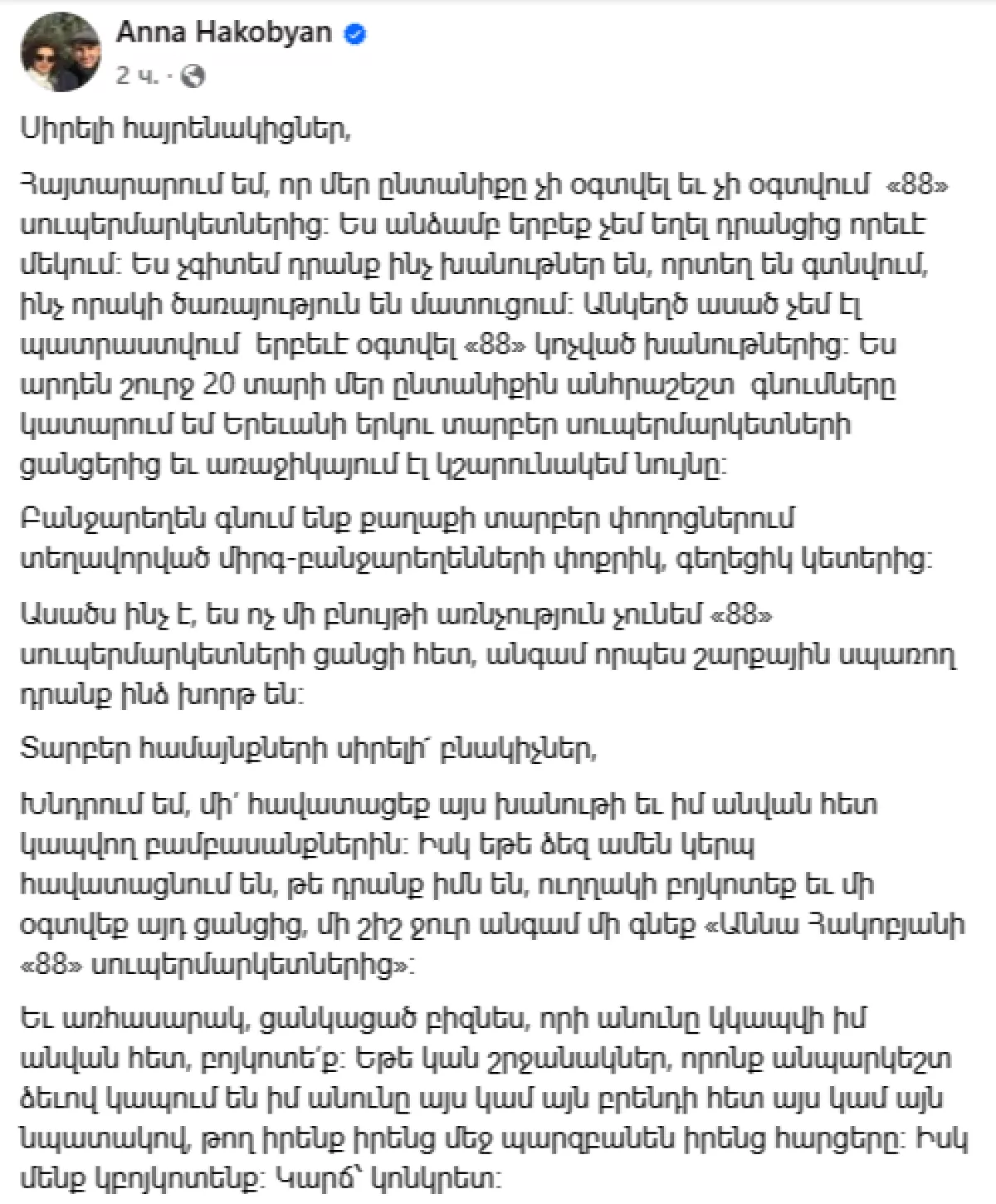 Супруга премьер-министра Армении Анна Акопян заявила, что не имеет никакого отношения к сети армянских супермаркетов «88» и никогда не пользовалась их услугами, призвав граждан не верить распространяемым сплетням и бойкотировать бизнесы, которые ошибочно связывают с её именем.